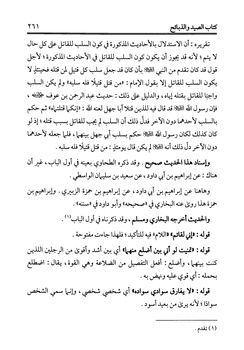 تقريره: أن الاستدلال بالأحاديث المذكورة في كون السلب للقاتل على كل حال لا يتم؛ لأنه قد يجوز أن يكون كون السلب للقاتل في الأحاديث المذكورة؛ لأجل قول قد كان تقدم من النبي -عليه السلام- بأن كان قد جعل سلب كل قتيل لمن قتله فحينئذٍ لا يكون السلب للقاتل إلا بقول الإِمام: "من قتل قتيلاً فله سلبه" ولم يكن السلب واجبًا للقاتل بقتله إياه، والدليل على ذلك: حديث عبد الرحمن بن عوف -رضي الله عنه-، فإن رسول الله -عليه السلام- قد قال فيه للذين قتلا أبا جهل لعنه الله: "إنكما قتلتماه" ثم حكم بالسلب لأحدهما دون الآخر فدلَّ ذلك أن السلب لم يجب للقاتل بسبب قتله؛ إذ لو كان كذلك لكان رسول الله -عليه السلام- حكم بسلب أبي جهل بينهما، فلما جعله لأحدهما دون الآخر دلّ ذلك أنه -عليه السلام- لم يكن قال يومئذٍ: من قتل قتيلاً فله سلبه.