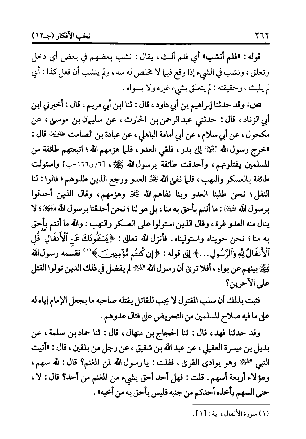 ص: وقد حدثنا إبراهيم بن أبي داود، قال: ثنا ابن أبي مريم، قال: أخبرني ابن أبي الزناد، قال: حدثني عبد الرحمن بن الحارث، عن سليمان بن موسى، عن مكحول، عن أبي سلام، عن أبي أمامة الباهلي، عن عبادة بن الصامت -رضي الله عنهما- قال: "خرج رسول الله -عليه السلام- إلى بدر، فلقي العدو، فلما هزمهم الله؛ اتبعتهم طائفة من المسلمين يقتلونهم، وأحدقت طائفة برسول الله - صلى الله عليه وسلم -، واستولت طائفة بالعسكر والنهب، فلما نفى الله -عز وجل- العدو ورجع الذين طلبوهم؛ قالوا: لنا النفل؛ نحن طلبنا العدو وبنا نفاهم الله -عز وجل- وهزمهم، وقال الذين أحدقوا برسول الله -عليه السلام-: ما أنتم بأحق به منا، بل هو لنا؛ نحن أحدقنا برسول الله -عليه السلام-؛ لا ينال منه العدو غرة، وقال الدين استولوا على العسكر والنهب: والله ما أنتم بأحق به منا؛ نحن حويناه واستوليناه. فأنزل الله تعالى: {يَسْأَلُونَكَ عَنِ الْأَنْفَالِ قُلِ الْأَنْفَالُ لِلَّهِ وَالرَّسُولِ ...} إلى قوله: {إِنْ كُنْتُمْ مُؤْمِنِينَ} (¬1) فقسمه رسول الله - صلى الله عليه وسلم - بينهم عن بواءٍ، أفلا ترى أن رسول الله -عليه السلام- لم يفضل في ذلك الدين تولوا القتل على الآخرين؟