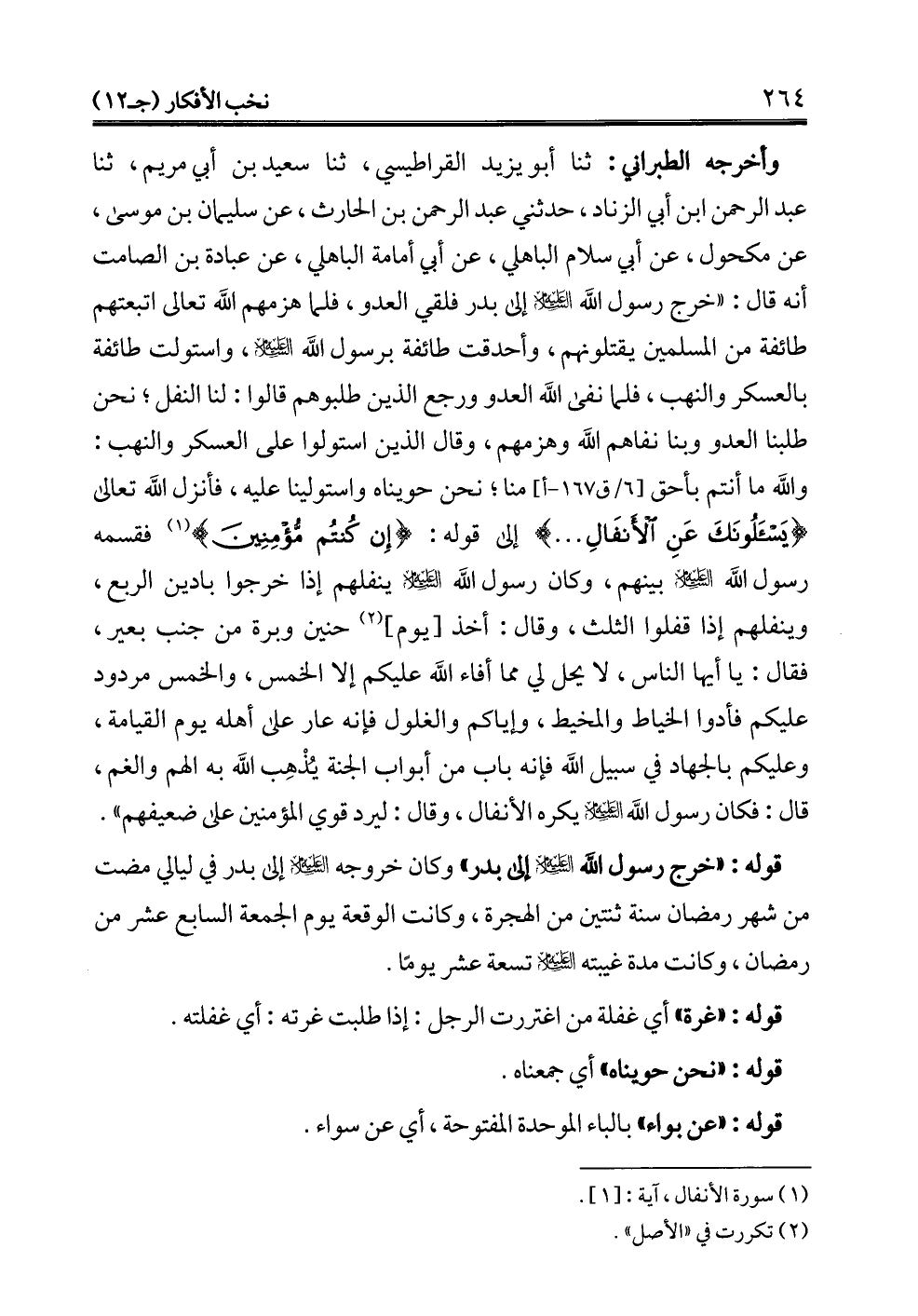 وأخرجه الطبراني: ثنا أبو يزيد القراطيسي، ثنا سعيد بن أبي مريم، ثنا عبد الرحمن ابن أبي الزناد، حدثني عبد الرحمن بن الحارث، عن سليمان بن موسى، عن مكحول، عن أبي سلام الباهلي، عن أبي أمامة الباهلي، عن عبادة بن الصامت أنه قال: "خرج رسول الله -عليه السلام- إلى بدر فلقي العدو، فلما هزمهم الله تعالى اتبعتهم طائفة من المسلمين يقتلونهم، وأحدقت طائفة برسول الله -عليه السلام-، واستولت طائفة بالعسكر والنهب، فلما نفى الله العدو ورجع الذين طلبوهم قالوا: لنا النفل؛ نحن طلبنا العدو وبنا نفاهم الله وهزمهم، وقال الذين استولوا على العسكر والنهب: والله ما أنتم بأحق منا؛ نحن حويناه واستولينا عليه، فأنزل الله تعالى {يَسْأَلُونَكَ عَنِ الْأَنْفَالِ} إلى قوله: {إِنْ كُنْتُمْ مُؤْمِنِينَ} (¬1) فقسمه رسول الله -عليه السلام- بينهم، وكان رسول الله - صلى الله عليه وسلم - ينفلهم إذا خرجوا بادين الربع، وينفلهم إذا قفلوا الثلث، وقال: أخذ [يوم] (¬2) حنين وبرة من جنب بعير، فقال: يا أيها الناس، لا يحل لي مما أفاء الله عليكم إلا الخمس، والخمس مردود عليكم فأدوا الخياط والمخيط، وإياكم والغلول فإنه عار على أهله يوم القيامة، وعليكم بالجهاد في سبيل الله فإنه باب من أبواب الجنة يُذْهِب الله به الهم والغم، قال: فكان رسول الله -عليه السلام- يكره الأنفال، وقال: ليرد قوي المؤمنين على ضعيفهم".