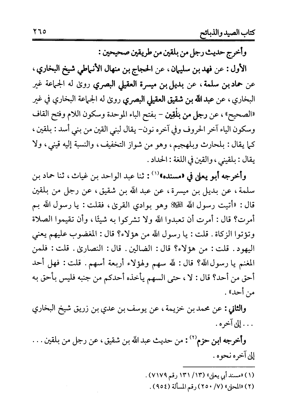 الأول: عن فهد بن سليمان، عن الحجاج بن منهال الأنماطي شيخ البخاري، عن حماد بن سلمة، عن بديل بن ميسرة العقيلي البصري روى له الجماعة غير البخاري، عن عبد الله بن شقيق العقيلي البصري روى له الجماعة البخاري في غير "الصحيح"، عن رجل من بَلْقِين -بفتح الباء الموحدة وسكون اللام وفتح القاف وسكون الياء آخر الحروف وفي آخره نون- يقال لبني القين من بني أسد: بلقين، كما يقال: بلحارث وبلهجيم، وهو من شواز التخفيف، والنسبة إليه قيني، ولا يقال: بلقيني، والقين في اللغة: الحداد.