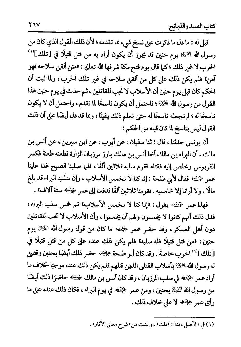 فهذا عمر -رضي الله عنه- يقول: "إنا كنا لا نخمس الأسلاب" ثم خمس سلب البراء، فدل ذلك أنهم كانوا لا يخمسون ولهم أن يخمسوا، وأن الأسلاب لا تجب للقاتلين دون أهل العسكر، وقد حضر عمر -رضي الله عنه- ما كان من قول رسول الله -عليه السلام- يوم حنين: "من قتل قتيلاً فله سلبه" فلم يكن ذلك عنده على كل من قتل قتيلاً في [تلك] (1) الحرب خاصةً. وقد كان أبو طلحة -رضي الله عنه- حضر ذلك أيضًا بحنين وقضى له رسول الله -عليه السلام- بأسلاب القتلى الذين قتلهم فلم يكن ذلك عنده موجبًا لخلاف ما أراد عمر -رضي الله عنه- في سلب المرزبان، وقد كان أنس بن مالك -رضي الله عنه- حاضرًا ذلك أيضًا من رسول الله -عليه السلام- بحنين، ومن عمر -رضي الله عنه- في يوم البراء، فكان ذلك عنده على ما رأى عمر -رضي الله عنه- لا على خلاف ذلك.