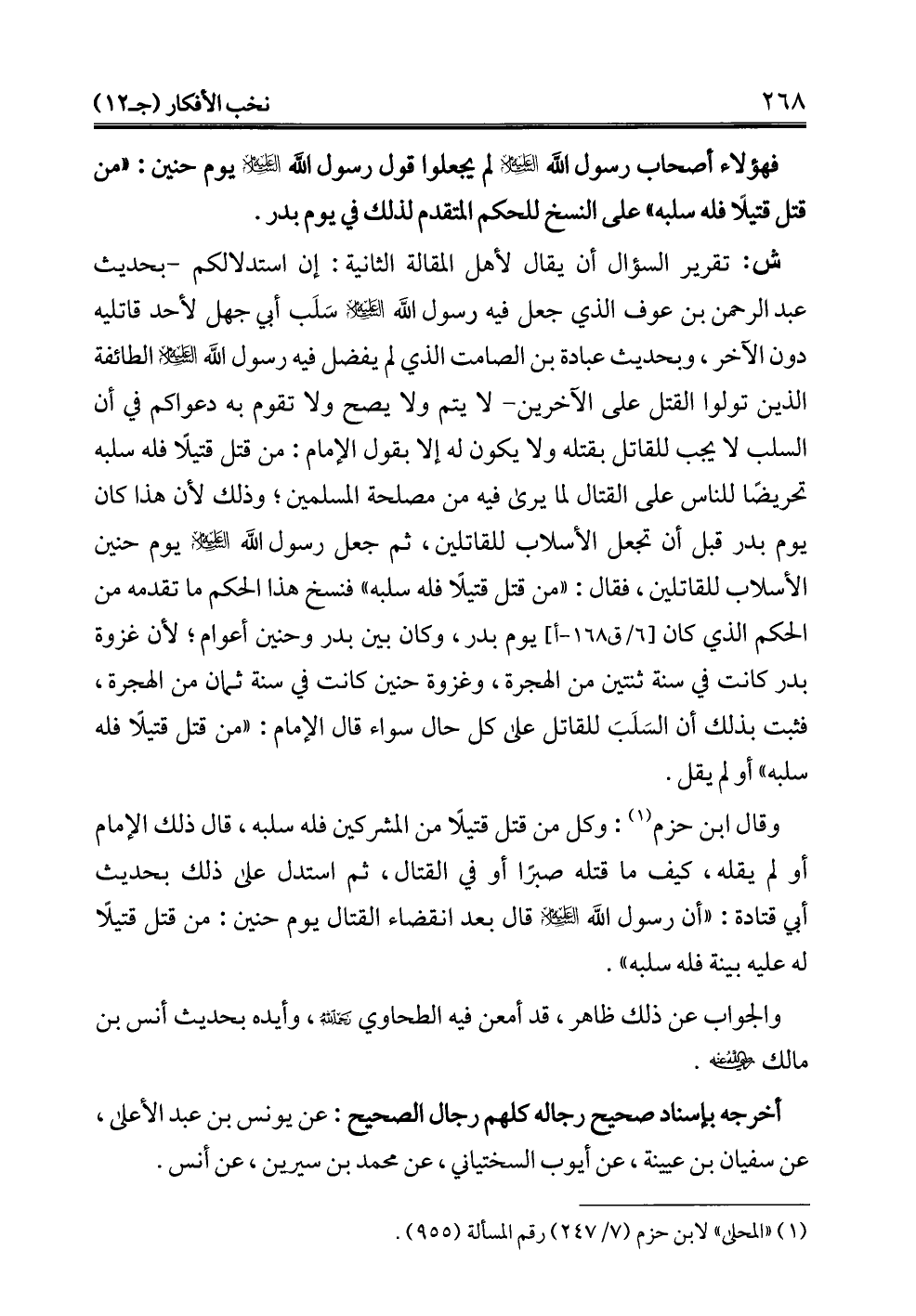 ش: تقرير السؤال أن يقال لأهل المقالة الثانية: إن استدلالكم -بحديث عبد الرحمن بن عوف الذي جعل فيه رسول الله -عليه السلام- سَلَب أبي جهل لأحد قاتليه دون الآخر، وبحديث عبادة بن الصامت الذي لم يفضل فيه رسول الله -عليه السلام- الطائفة الذين تولوا القتل على الآخرين- لا يتم ولا يصح ولا تقوم به دعواكم في أن السلب لا يجب للقاتل بقتله ولا يكون له إلا بقول الإِمام: من قتل قتيلاً فله سلبه تحريضًا للناس على القتال لما يرى فيه من مصلحة المسلمين؛ وذلك لأن هذا كان يوم بدر قبل أن تجعل الأسلاب للقاتلين، ثم جعل رسول الله -عليه السلام- يوم حنين الأسلاب للقاتلين، فقال: "من قتل قتيلاً فله سلبه" فنسخ هذا الحكم ما تقدمه من الحكم الذي كان يوم بدر، وكان بين بدر وحنين أعوام؛ لأن غزوة بدر كانت في سنة ثنتين من الهجرة، وغزوة حنين كانت في سنة ثمان من الهجرة، فثبت بذلك أن السَلَبَ للقاتل على كل حال سواء قال الإِمام: "من قتل قتيلاً فله سلبه" أو لم يقل.