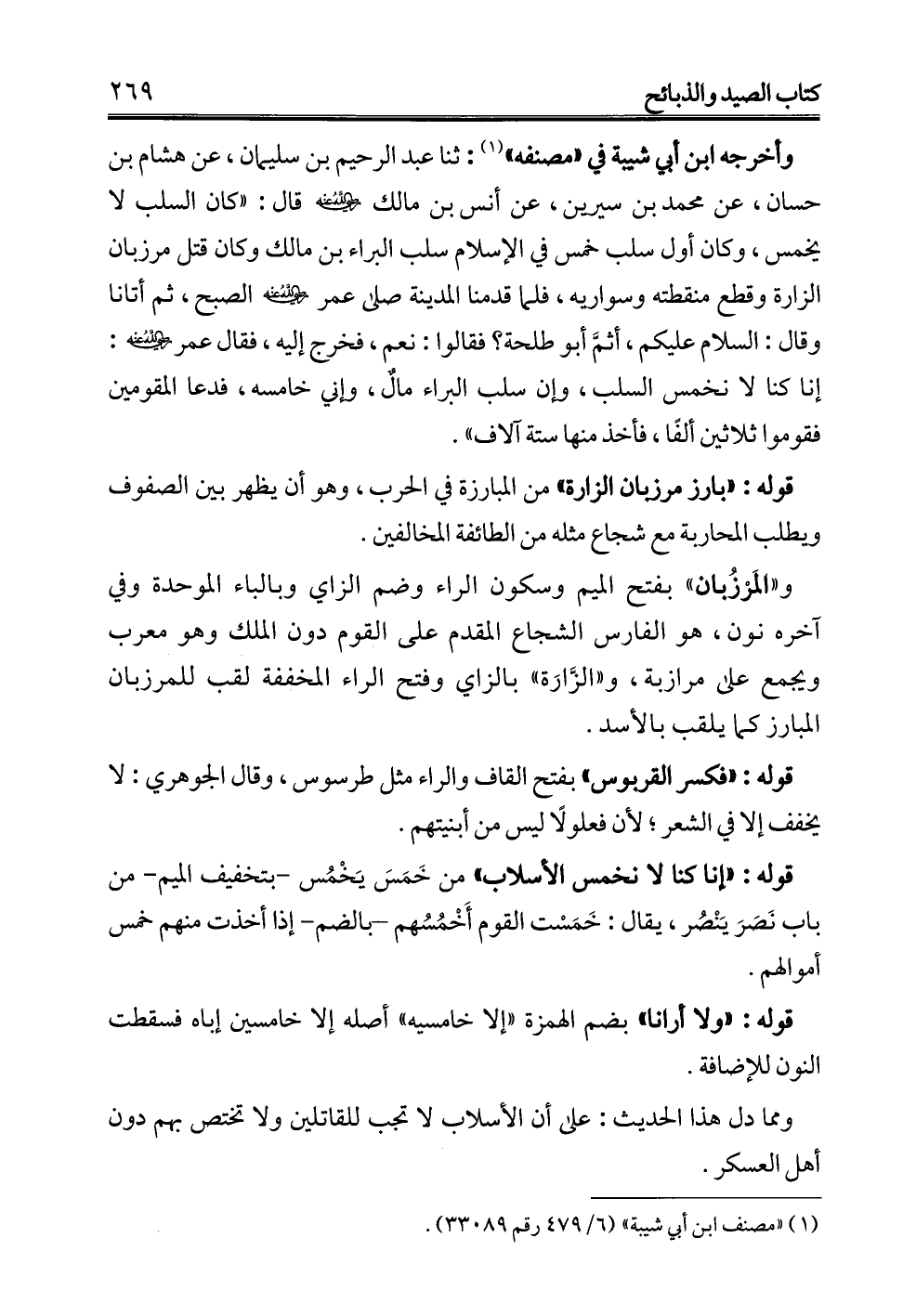 وأخرجه ابن أبي شيبة في "مصنفه" (¬1): ثنا عبد الرحيم بن سليمان، عن هشام بن حسان، عن محمد بن سيرين، عن أنس بن مالك -رضي الله عنه- قال: "كان السلب لا يخمس، وكان أول سلب خمس في الإِسلام سلب البراء بن مالك وكان قتل مرزبان الزارة وقطع منقطته وسواريه، فلما قدمنا المدينة صلى عمر -رضي الله عنه- الصبح، ثم أتانا وقال: السلام عليكم، أثمَّ أبو طلحة؟ فقالوا: نعم، فخرج إليه، فقال عمر -رضي الله عنه-: إنا كنا لا نخمس السلب، وإن سلب البراء مالٌ، وإني خامسه، فدعا المقومين فقوموا ثلاثين ألفًا، فأخذ منها ستة آلاف".