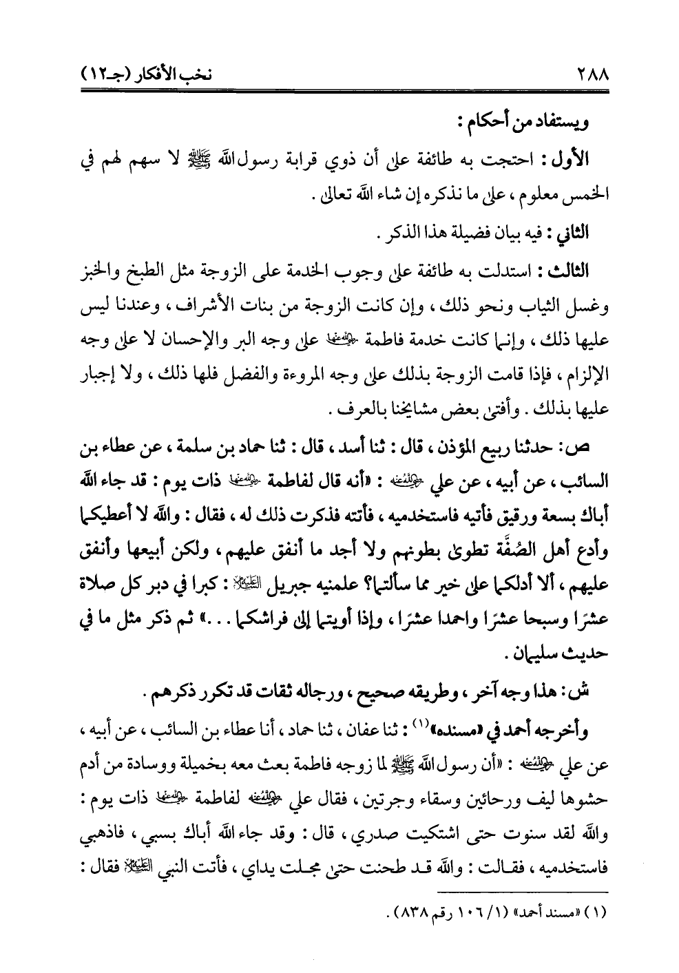 وأخرجه أحمد في "مسنده" (¬1): ثنا عفان، ثنا حماد، أنا عطاء بن السائب، عن أبيه، عن علي -رضي الله عنه-: "أن رسول الله - صلى الله عليه وسلم - لما زوجه فاطمة بعث معه بخميلة ووسادة من أدم حشوها ليف ورحائين وسقاء وجرتين، فقال علي -رضي الله عنه- لفاطمة -رضي الله عنها- ذات يوم: والله لقد سنوت حتى اشتكيت صدري، قال: وقد جاء الله أباك بسبي، فاذهبي فاستخدميه، فقالت: والله قد طحنت حتى مجلت يداي، فأتت النبي -عليه السلام- فقال: