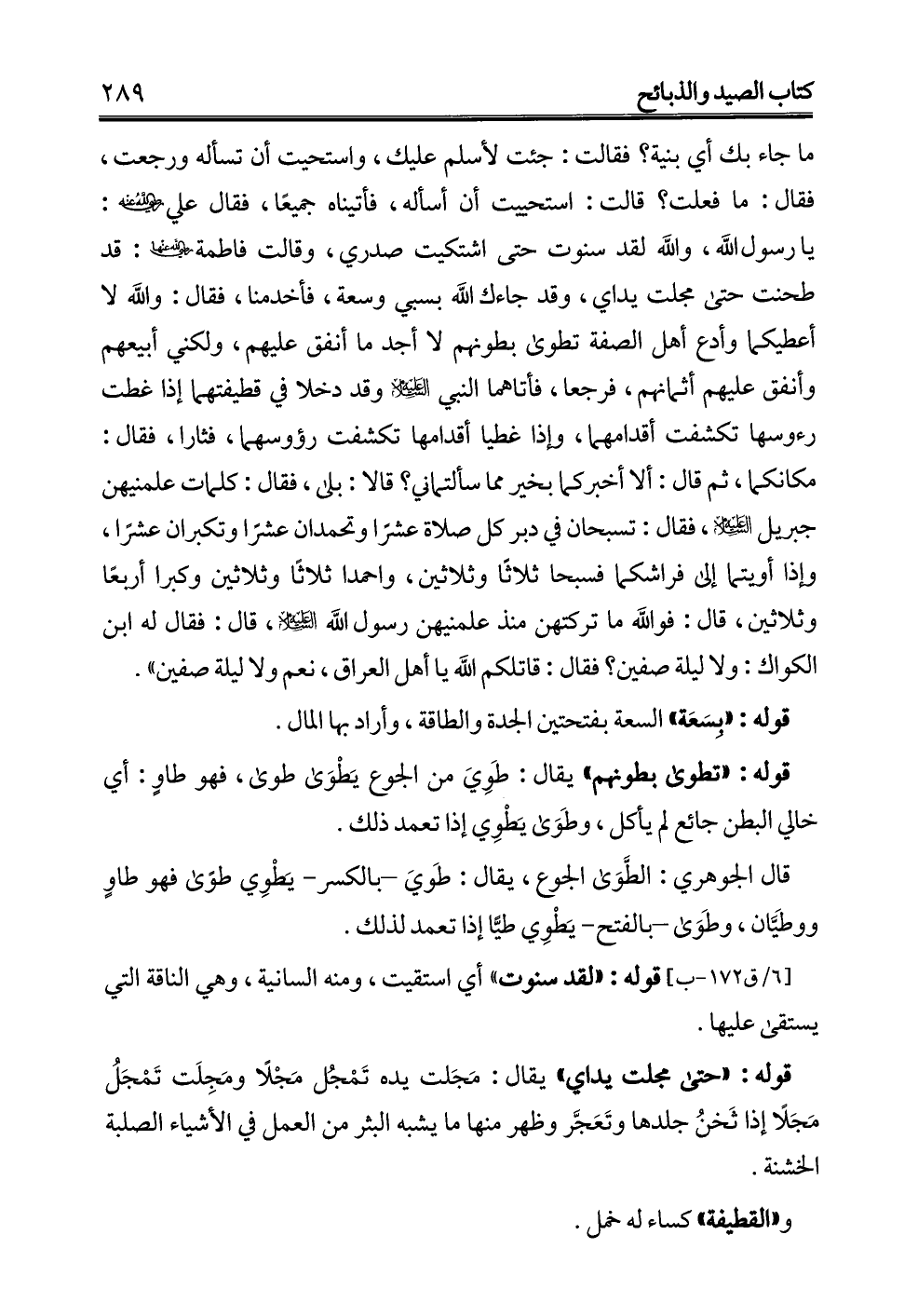 ما جاء بك أي بنية؟ فقالت: جئت لأسلم عليك، واستحيت أن تسأله ورجعت، فقال: ما فعلت؟ قالت: استحييت أن أسأله, فأتيناه جميعًا، فقال علي -رضي الله عنه-: يا رسول الله، والله لقد سنوت حتى اشتكيت صدري، وقالت فاطمة -رضي الله عنها-: قد طحنت حتى مجلت يداي، وقد جاءك الله بسبي وسعة، فأخدمنا، فقال: والله لا أعطيكما وأدع أهل الصفة تطوى بطونهم لا أجد ما أنفق عليهم، ولكني أبيعهم وأنفق عليهم أثمانهم، فرجعا، فأتاهما النبي -عليه السلام- وقد دخلا في قطيفتهما إذا غطت رءوسها تكشفت أقدامهما، وإذا غطيا أقدامها تكشفت رؤوسهما، فثارا، فقال: مكانكما، ثم قال: ألا أخبركما بخير مما سألتماني؟ قالا: بلى، فقال: كلمات علمنيهن جبريل -عليه السلام-، فقال: تسبحان في دبر كل صلاة عشرًا وتحمدان عشرًا وتكبران عشرًا، وإذا أويتما إلى فراشكما فسبحا ثلاثًا وثلاثين، واحمدا ثلاثاً وثلاثين وكبرا أربعًا وثلاثين، قال: فوالله ما تركتهن منذ علمنيهن رسول الله -عليه السلام-، قال: فقال له ابن الكواك: ولا ليلة صفين؟ فقال: قاتلكم الله يا أهل العراق، نعم ولا ليلة صفين".