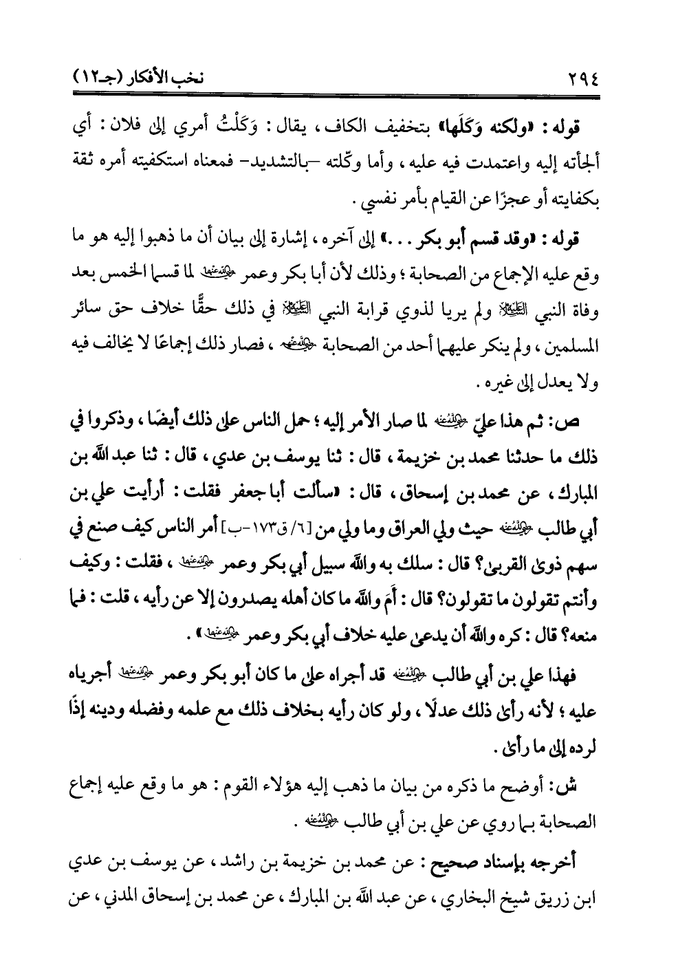 ص: ثم هذا عليّ -رضي الله عنه- لما صار الأمر إليه؛ حمل الناس على ذلك أيضًا، وذكروا في ذلك ما حدثنا محمد بن خزيمة، قال: ثنا يوسف بن عدي، قال: ثنا عبد الله بن المبارك، عن محمد بن إسحاق، قال: "سألت أبا جعفر فقلت: أرأيت علي بن أبي طالب -رضي الله عنه- حيث ولي العراق وما ولي من أمر الناس كيف صنع في سهم ذوى القربى؟ قال: سلك به والله سبيل أبي بكر وعمر -رضي الله عنهما-، فقلت: وكيف وأنتم تقولون ما تقولون؟ قال: أَمَ والله ما كان أهله يصدرون إلا عن رأيه، قلت: فما منعه؟ قال: كره والله أن يدعى عليه خلاف أبي بكر وعمر -رضي الله عنهما-".