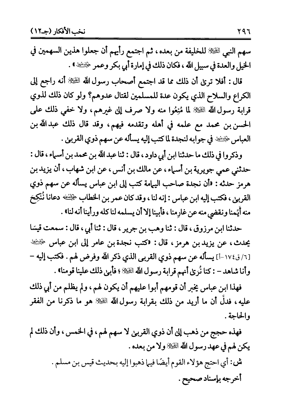 قال: أفلا ترى أن ذلك مما قد اجتمع أصحاب رسول الله -عليه السلام- أنه راجع إلى الكيل والسلاح الذي يكون عدة للمسلمين لقتال عدوهم؟ ولو كان ذلك لذوي قرابة رسول الله -عليه السلام- لما مُنِعُوا منه ولا صرف إلى غيرهم، ولا خفي ذلك على الحسن بن محمد مع علمه في أهله وتقدمه فيهم، وقد قال ذلك عبد الله بن العباس -رضي الله عنهما- في جوابه لنجدة لما كتب إليه يسأله عن سهم ذوي القربى.