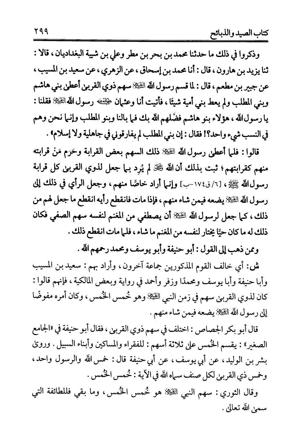وذكروا في ذلك ما حدثنا محمد بن بحر بن مطر وعلي بن شيبة البغداديان، قالا: ثنا يزيد بن هارون، قال: أنا محمد بن إسحاق، عن الزهري، عن سعيد بن المسيب، عن جبير بن مطعم، قال: لما قسم رسول الله -عليه السلام- سهم ذوي القربى أعطى بني هاشم وبني المطلب ولم يعط بني أمية شيئًا، فأتيت أنا وعثمان -رضي الله عنه- رسول الله -عليه السلام- فقلنا: يا رسول الله، هؤلاء بنو هاشم فضَّلهم الله بك فما بالنا وينو المطلب وإنما نحن وهم في النسب شيء واحد؟! فقال: إن بني المطلب لم يفارقوني في جاهلية ولا إسلام".