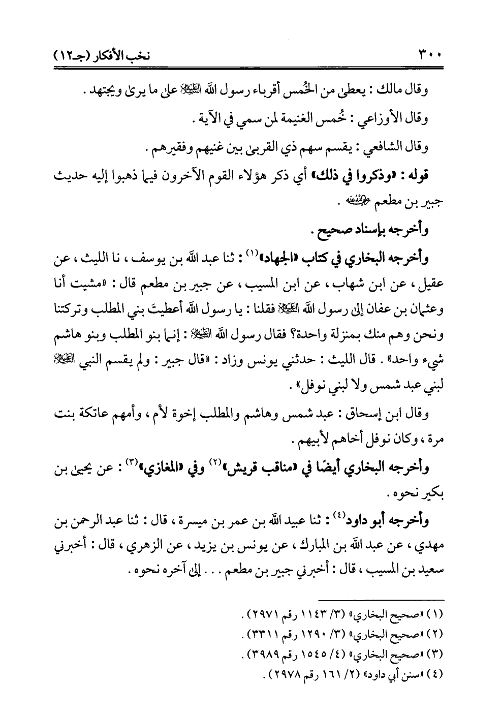 وأخرجه البخاري في كتاب "الجهاد" (¬1): ثنا عبد الله بن يوسف، نا الليث، عن عقيل، عن ابن شهاب، عن ابن المسيب، عن جبير بن مطعم قال: "مشيت أنا وعثمان بن عفان إلى رسول الله -عليه السلام- فقلنا: يا رسول الله أعطيتَ بني المطلب وتركتنا ونحن وهم منك بمنزلة واحدة؟ فقال رسول الله -عليه السلام-: إنما بنو المطلب وبنو هاشم شيء واحد". قال الليث: حدثني يونس وزاد: "قال جبير: ولم يقسم النبي -عليه السلام- لبني عبد شمس ولا لبني نوفل".