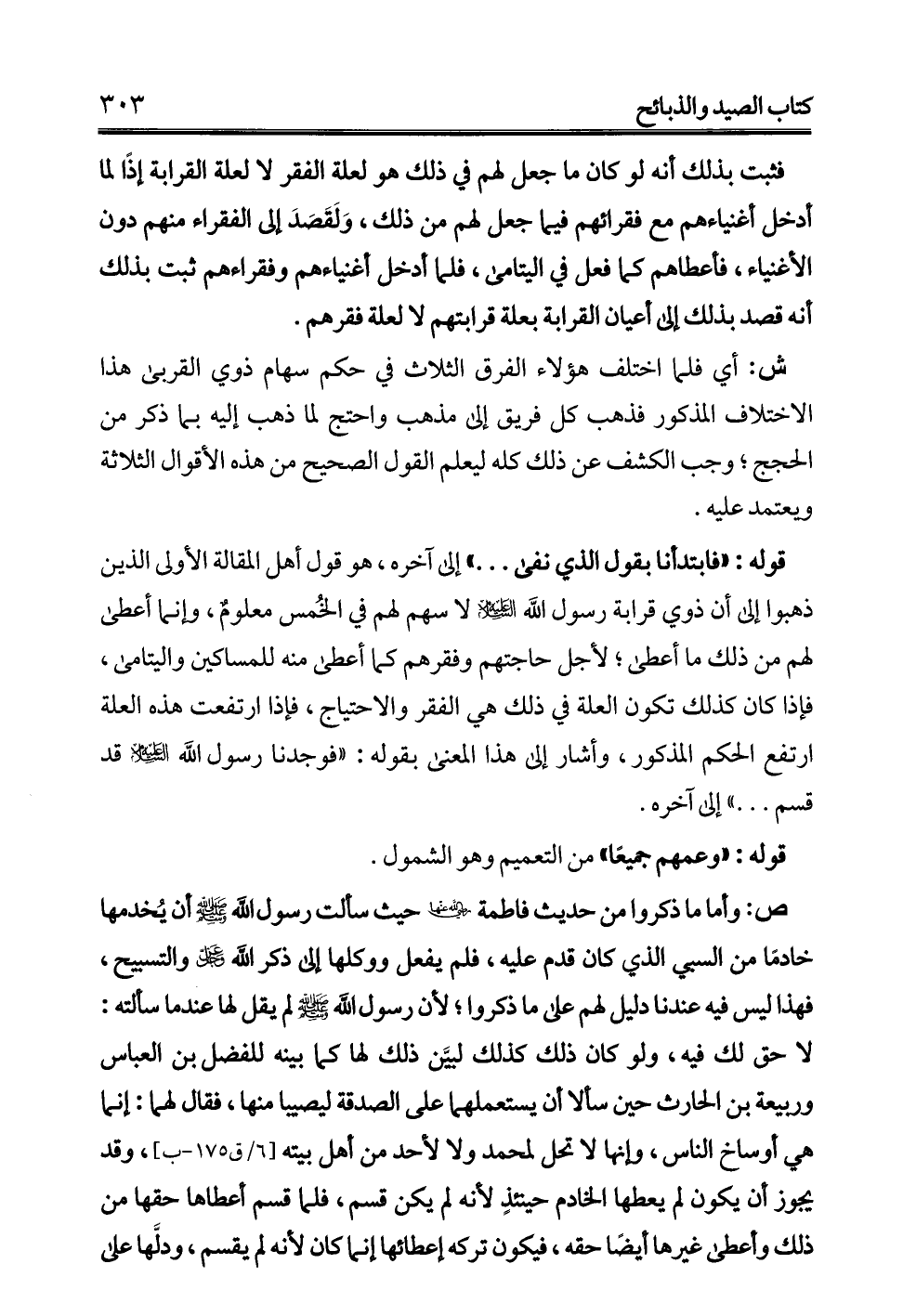 ص: وأما ما ذكروا من حديث فاطمة -رضي الله عنها- حيث سألت رسول الله - صلى الله عليه وسلم - أن يُخدمها خادمًا من السبي الذي كان قدم عليه، فلم يفعل ووكلها إلى ذكر الله -عز وجل- والتسبيح، فهذا ليس فيه عندنا دليل لهم على ما ذكروا؛ لأن رسول الله - صلى الله عليه وسلم - لم يقل لها عندما سألته: لا حق لك فيه، ولو كان ذلك كذلك لبيَّن ذلك لها كما بينه للفضل بن العباس وربيعة بن الحارث حين سألا أن يستعملهما على الصدقة ليصيبا منها، فقال لهما: إنما هي أوساخ الناس، وإنها لا تحل لمحمد ولا لأحد من أهل بيته وقد يجوز أن يكون لم يعطها الخادم حينئذٍ لأنه لم يكن قسم، فلما قسم أعطاها حقها من ذلك وأعطى غيرها أيضًا حقه، فيكون تركه إعطائها إنما كان لأنه لم يقسم، ودلَّها على