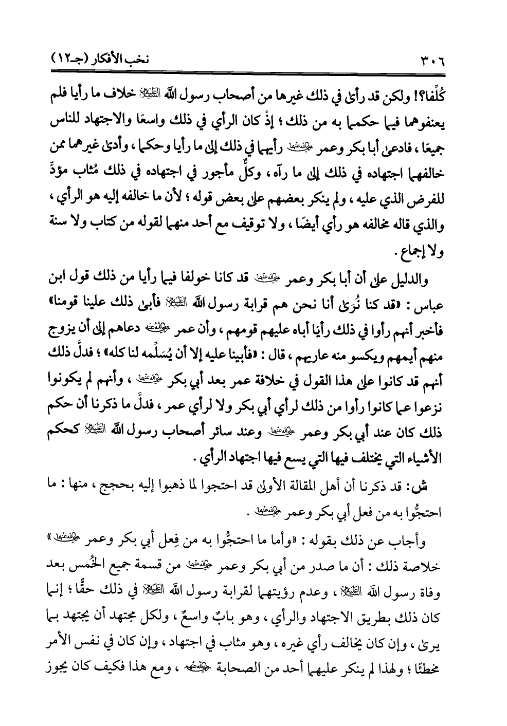 وأجاب عن ذلك بقوله: "وأما ما احتجُّوا به من فِعل أبي بكر وعمر -رضي الله عنهما-" خلاصة ذلك: أن ما صدر من أبي بكر وعمر -رضي الله عنهما- من قسمة جميع الخُمس بعد وفاة رسول الله -عليه السلام-، وعدم رؤيتهما لقرابة رسول الله -عليه السلام- في ذلك حقًّا؛ إنما كان ذلك بطريق الاجتهاد والرأي، وهو بابٌ واسعٌ، ولكل مجتهد أن يجتهد بما يرى، وإن كان يخالف رأي غيره، وهو مثاب في اجتهاد، وإن كان في نفس الأمر مخطئًا؛ ولهذا لم ينكر عليهما أحد من الصحابة -رضي الله عنهم-، ومع هذا فكيف كان يجوز