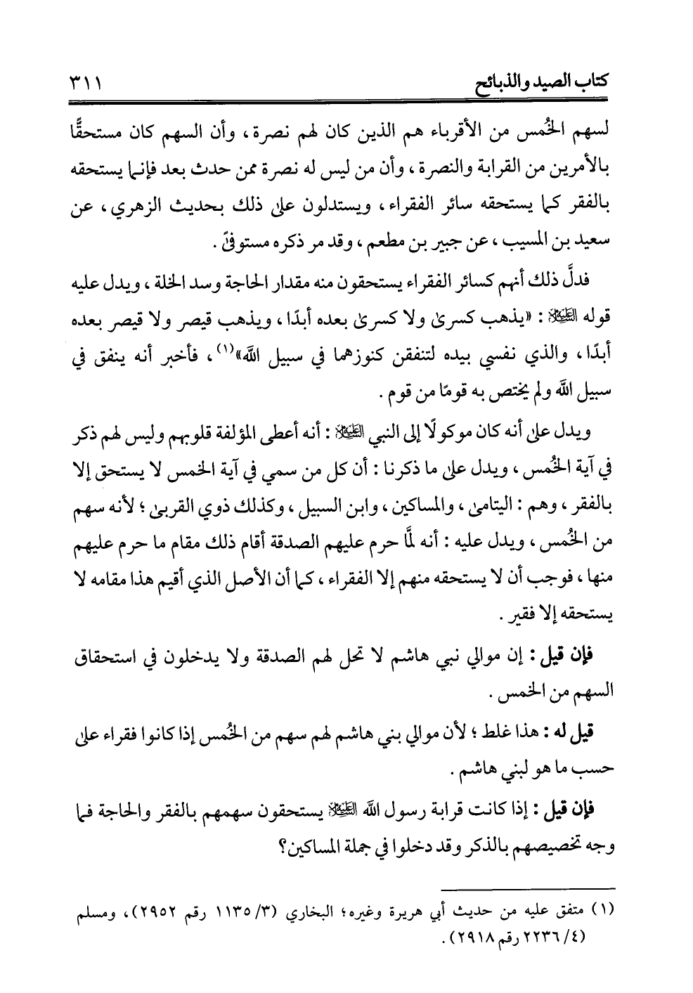لسهم الخُمس من الأقرباء هم الذين كان لهم نصرة، وأن السهم كان مستحقًّا بالأمرين من القرابة والنصرة، وأن من ليس له نصرة ممن حدث بعد فإنما يستحقه بالفقر كما يستحقه سائر الفقراء، ويستدلون على ذلك بحديث الزهري، عن سعيد بن المسيب، عن جبير بن مطعم، وقد مر ذكره مستوفىً.
