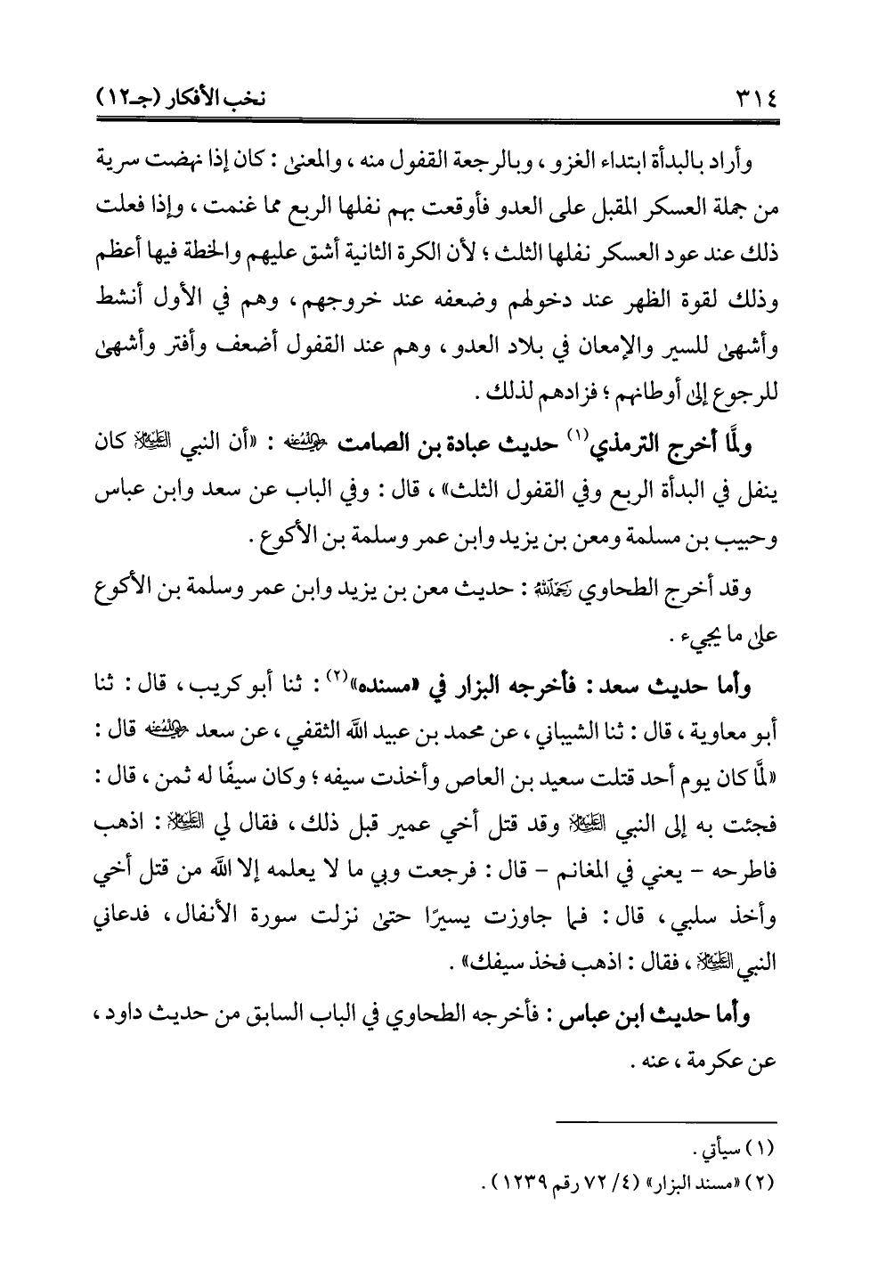 ولمَّا أخرج الترمذي (¬1) حديث عبادة بن الصامت -رضي الله عنه-: "أن النبي -عليه السلام- كان ينفل في البدأة الربع وفي القفول الثلث"، قال: وفي الباب عن سعد وابن عباس وحبيب بن مسلمة ومعن بن يزيد وابن عمر وسلمة بن الأكوع.