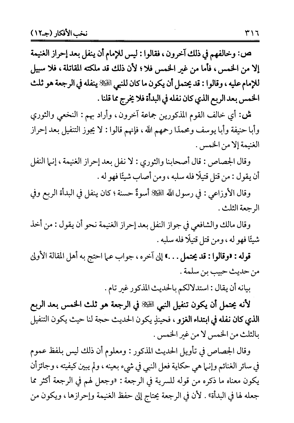 لأنه يحتمل أن يكون تنفيل النبي -عليه السلام- في الرجعة هو ثلث الخمس بعد الربع الذي كان نفله في ابتداء الغزو، فحينذٍ يكون الحديث حجة لنا حيث يكون التنفيل بالثلث من الخمس لا من غير الخمس.