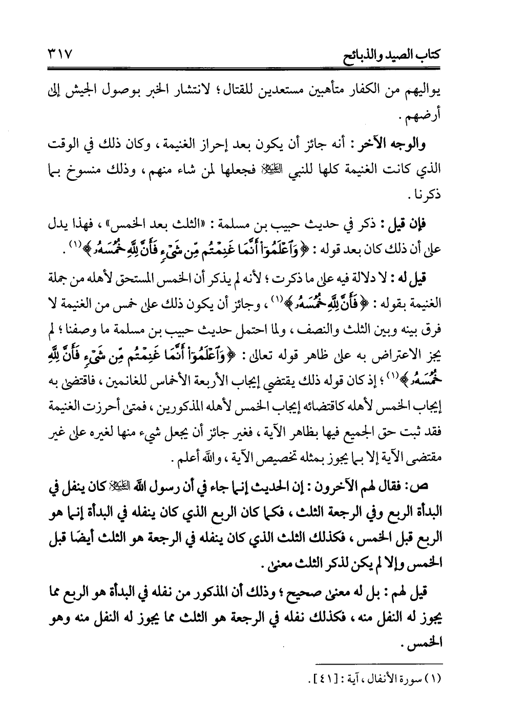 ص: فقال لهم الآخرون: إن الحديث إنما جاء في أن رسول الله -عليه السلام- كان ينفل في البدأة الربع وفي الرجعة الثلث، فكما كان الربع الذي كان ينفله في البدأة إنما هو الربع قبل الخمس، فكذلك الثلث الذي كان ينفله في الرجعة هو الثلث أيضًا قبل الخمس وإلا لم يكن لذكر الثلث معنى.