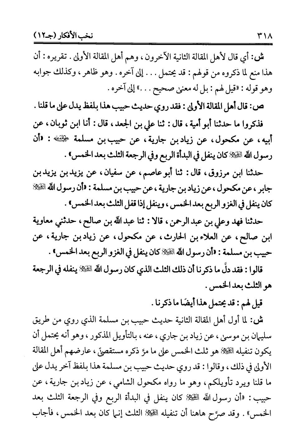 ش: لما أول أهل المقالة الثانية حديث حبيب بن مسلمة الذي روي من طريق سليمان بن موسى، عن زياد بن جاري، عنه، بالتأويل المذكور، وهو أنه يحتمل أن يكون تنفيله -عليه السلام- هو ثلث الخمس على ما مرَّ ذكره مستقصىً، عارضهم أهل المقالة الأولى في ذلك، وقالوا: قد روي حديث حبيب بن مسلمة هذا بلفظ آخر يدل على ما قلنا ويرد تأويلكم، وهو ما رواه مكحول الشامي، عن زياد بن جارية، عن حبيب: "أن رسول الله -عليه السلام- كان ينفل في البدأة الربع وفي الرجعة الثلث بعد الخمس". وقد صرَّح ها هنا أن تنفيله -عليه السلام- الثلث إنما كان بعد الخمس، فأجاب