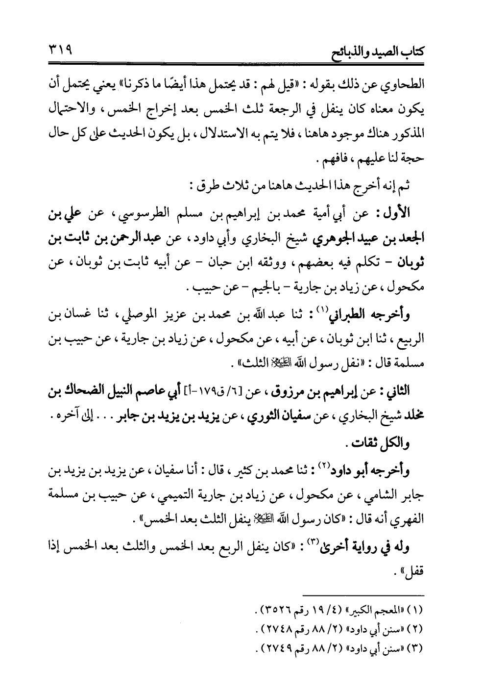 الطحاوي عن ذلك بقوله: "قيل لهم: قد يحتمل هذا أيضًا ما ذكرنا" يعني يحتمل أن يكون معناه كان ينفل في الرجعة ثلث الخمس بعد إخراج الخمس، والاحتمال المذكور هناك موجود ها هنا، فلا يتم به الاستدلال، بل يكون الحديث على كل حال حجة لنا عليهم، فافهم.