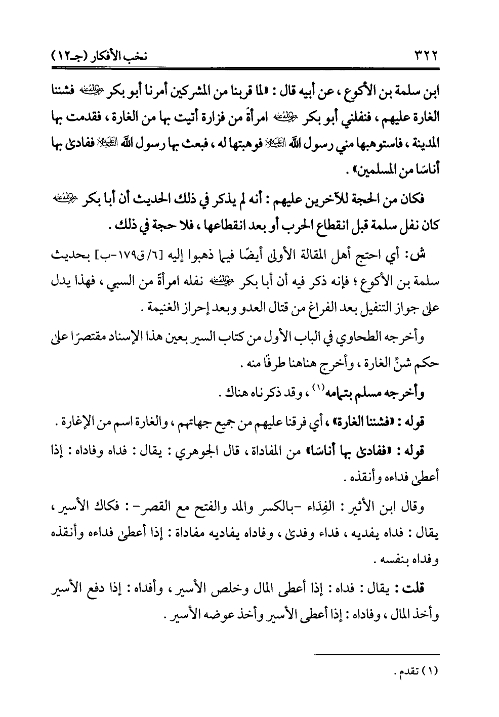 ش: أي احتج أهل المقالة الأولى أيضًا فيما ذهبوا إليه بحديث سلمة بن الأكوع؛ فإنه ذكر فيه أن أبا بكر -رضي الله عنه- نفله امرأةً من السبي، فهذا يدل على جواز التنفيل بعد الفراغ من قتال العدو وبعد إحراز الغنيمة.
