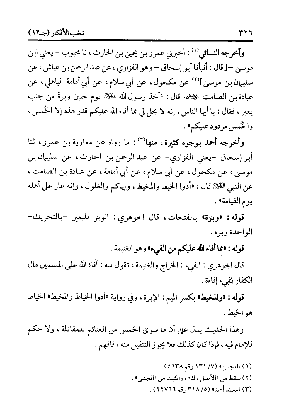 وأخرجه النسائي (¬1): أخبرني عمرو بن يحيى بن الحارث، نا محبوب -يعني ابن موسى-[قال: أنبأنا أبو إسحاق -وهو الفزاري، عن عبد الرحمن بن عياش، عن سليمان بن موسى] (¬2) عن مكحول، عن أبي سلام، عن أبي أمامة الباهلي، عن عبادة بن الصامت -رضي الله عنهما- قال: "أخذ رسول الله -عليه السلام- يوم حنين وبرةً من جنب بعير، فقال: يا أيها الناس، إنه لا يحل لي مما أفاء الله عليكم قدر هذه إلا الخُمس، والخُمس مردود عليكم".