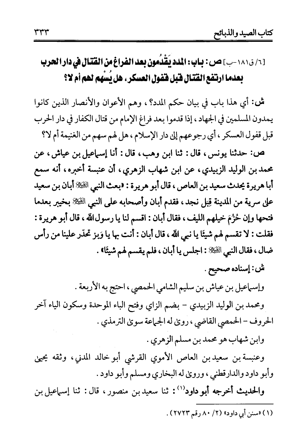 ص: حدثنا يونس، قال: ثنا ابن وهب، قال: أنا إسماعيل بن عياش، عن محمد بن الوليد الزبيدي، عن ابن شهاب الزهري، أن عنبسة أخبره، أنه سمع أبا هريرة يحدث سعيد بن العاص، قال أبو هريرة: "بعث النبي -عليه السلام- أبان بن سعيد على سرية من المدينة قِبَل نجد، فقدم أبان وأصحابه على النبي -عليه السلام- بخيبر بعدما فتحها وإن حُزُمَ خيلهم الليف، فقال أبان: اقسم لنا يا رسول الله، قال أبو هريرة: فقلت: لا تقسم لهم شيئًا يا نبي الله، قال أبان: أنت بها يا وَبرْ تحدّر علينا من رأس ضال، فقال النبي -عليه السلام-: اجلس يا أبان، فلم يقسم لهم شيئًا".