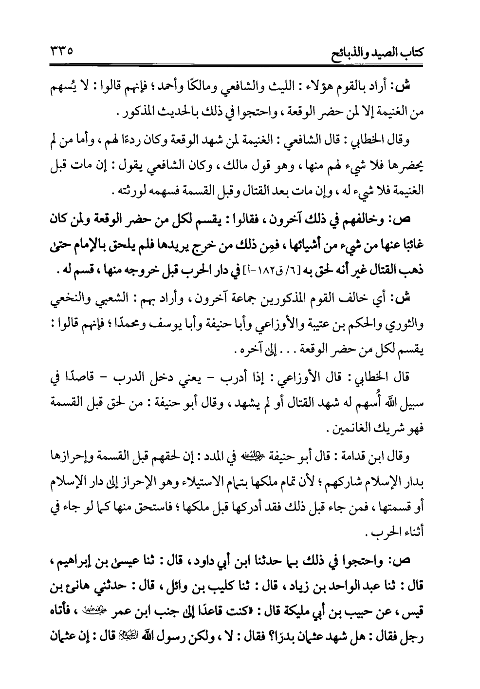 ش: أي خالف القوم المذكورين جماعة آخرون، وأراد بهم: الشعبي والنخعي والثوري والحكم بن عتيبة والأوزاعي وأبا حنيفة وأبا يوسف ومحمدًا؛ فإنهم قالوا: يقسم لكل من حضر الوقعة. . . إلى آخره.