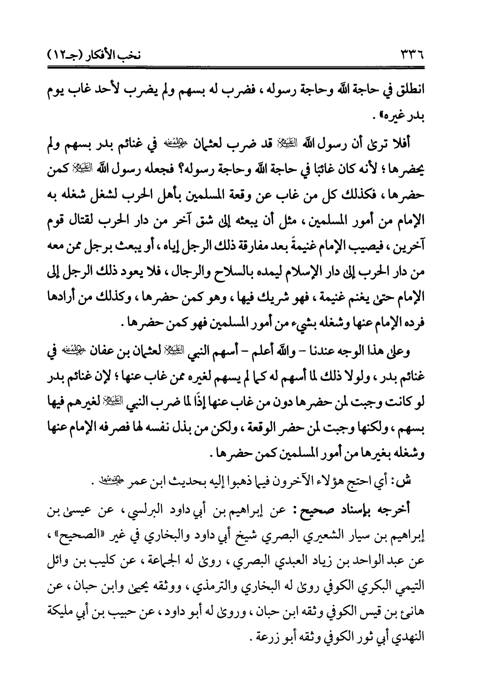 أفلا ترى أن رسول الله -عليه السلام- قد ضرب لعثمان -رضي الله عنه- في غنائم بدر بسهم ولم يحضرها؛ لأنه كان غائبًا في حاجة الله وحاجة رسوله؟ فجعله رسول الله -عليه السلام- كمن حضرها، فكذلك كل من غاب عن وقعة المسلمين بأهل الحرب لشغل شغله به الإِمام من أمور المسلمين، مثل أن يبعثه إلى شق آخر من دار الحرب لقتال قوم آخرين، فيصيب الإِمام غنيمةً بعد مفارقة ذلك الرجل إياه، أو يبعث برجل ممن معه من دار الحرب إلى دار الإِسلام ليمده بالسلاح والرجال، فلا يعود ذلك الرجل إلى الإِمام حتى يغنم غنيمة، فهو شريك فيها، وهو كمن حضرها، وكذلك من أرادها فرده الإِمام عنها وشغله بشيء من أمور المسلمين فهو كمن حضرها.