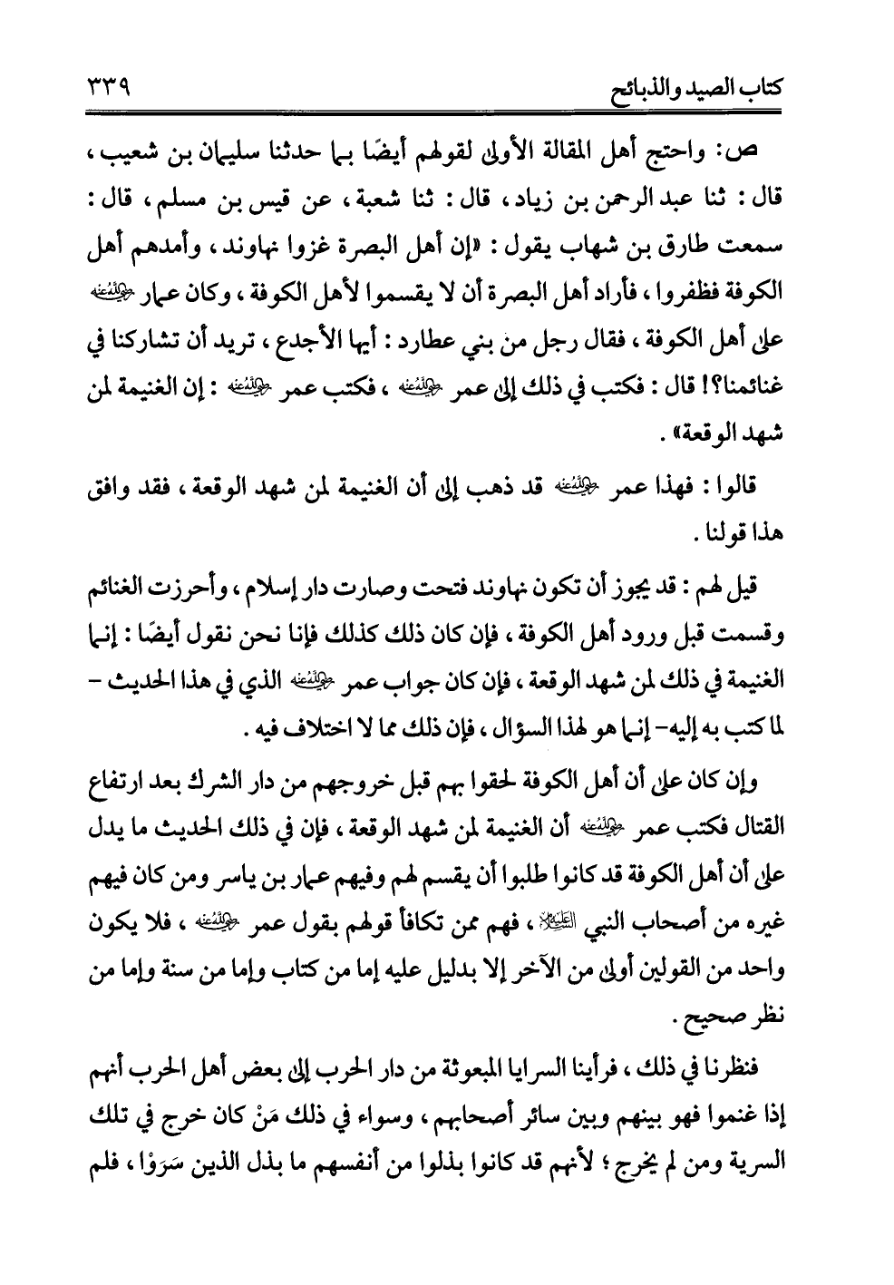 وإن كان على أن أهل الكوفة لحقوا بهم قبل خروجهم من دار الشرك بعد ارتفاع القتال فكتب عمر -رضي الله عنه- أن الغنيمة لمن شهد الوقعة، فإن في ذلك الحديث ما يدل على أن أهل الكوفة قد كانوا طلبوا أن يقسم لهم وفيهم عمار بن ياسر ومن كان فيهم غيره من أصحاب النبي -عليه السلام-، فهم ممن تكافأ قولهم بقول عمر -رضي الله عنه-، فلا يكون واحد من القولين أولى من الآخر إلا بدليل عليه إما من كتاب وإما من سنة وإما من نظر صحيح.