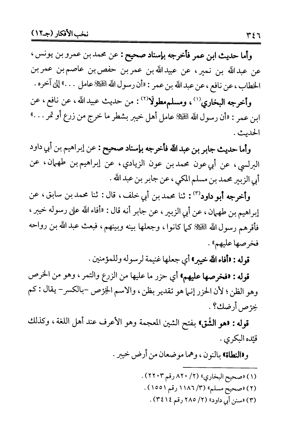 وأما حديث ابن عمر فأخرجه بإسناد صحيح: عن محمد بن عمرو بن يونس، عن عبد الله بن نمير، عن عبيد الله بن عمر بن حفص بن عاصم بن عمر بن الخطاب، عن نافع، عن عبد الله بن عمر: "أن رسول الله -عليه السلام- عامل. . ." إلى آخره.