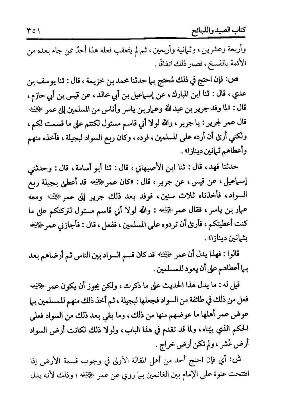 حدثنا فهد، قال: ثنا ابن الأصبهاني، قال: ثنا أبو أسامة، قال: وحدثني إسماعيل، عن قيس، عن جرير، قال: "كان عمر -رضي الله عنه- قد أعطى بجيلة ربع السواد، فأخذناه ثلاث سنين، فوفد بعد ذلك جرير إلى عمر -رضي الله عنه- ومعه عمار بن ياسر، فقال عمر -رضي الله عنه-: والله لولا أني قاسم مسئول لتركتكم على ما كنت أعطيتكم، فأرى أن تردوه على المسلمين، ففعل، قال: فأجازني عمر -رضي الله عنه- بثمانين دينارًا".
