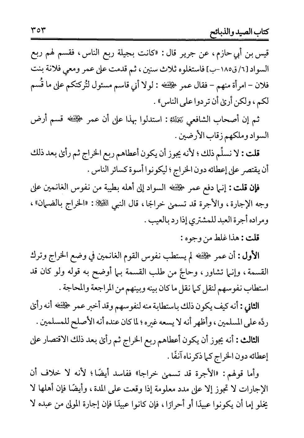 فإذا قلت: إنما دفع عمر -رضي الله عنه- السواد إلى أهله بطيبة من نفوس الغانمين على وجه الإِجارة، والأجرة قد تسمى خراجًا، قال النبي -عليه السلام-: "الخراج بالضمان"، ومراده أجرة العبد للمشتري إذا رد بالعيب.
