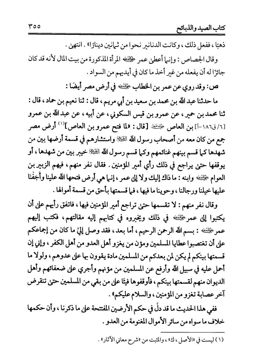 ما حدثنا عبد الله بن محمد بن سعيد بن أبي مريم، قال: ثنا نعيم بن حماد، قال: ثنا محمد بن حمير، عن عمرو بن قيس السكوني، عن أبيه، عن عبد الله بن عمرو بن العاص -رضي الله عنهما-[قال: "لما فتح عمرو بن العاص] (¬1) أرض مصر جمع من كان معه من أصحاب رسول الله -عليه السلام- واستشارهم في قسمة أرضها بين من شهدها كما قسم بينهم غنائمهم وكما قسم رسول الله -عليه السلام- خيبر بين من شهدها، أو يوقفها حتى يراجع في ذلك رأي أمير المؤمنين. فقال نفر منهم، فيهم الزبير بن العوام -رضي الله عنه- وابنه: ما ذاك إليك ولا إلى عمر، إنما هي أرض فتحها الله علينا وأَجَفْنَا عليها خيلنا ورجالنا، وحوينا ما فيها، فما قسمتها بأحق من قسمة أموالها.