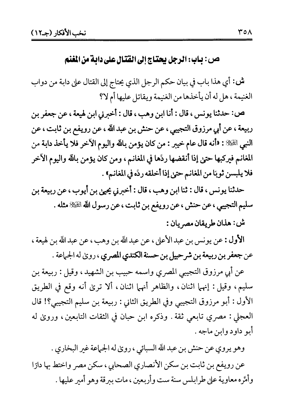 ص: حدثنا يونس، قال: أنا ابن وهب، قال: أخبرني ابن لهيعة، عن جعفر بن ربيعة، عن أبي مرزوق التجيبي، عن حنش بن عبد الله، عن رويفع بن ثابت، عن النبي -عليه السلام-: "أنه قال عام خيبر: من كان يؤمن بالله واليوم الآخر فلا يأخذ دابة من المغانم فيركبها حتى إذا أنقضها ردَّها في المغانم، ومن كان يؤمن بالله واليوم الآخر فلا يلبسن ثوبًا من المغانم حتى إذا أخلقه ردَّه في المغانم".