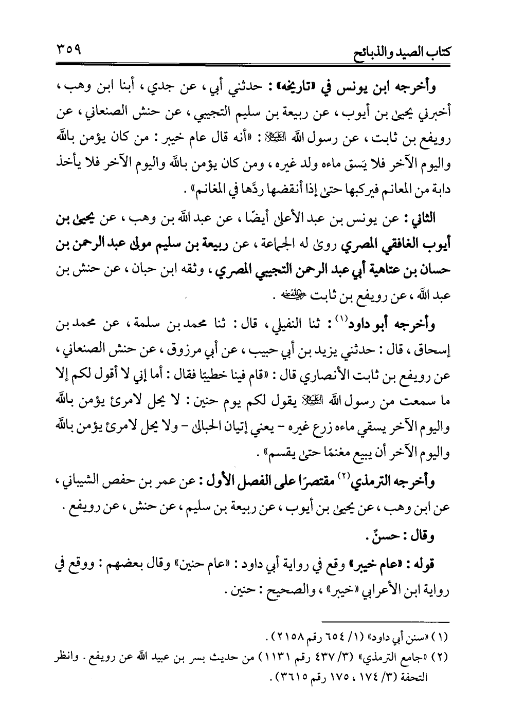 وأخرجه الترمذي (¬2) مقتصرًا على الفصل الأول: عن عمر بن حفص الشيباني، عن ابن وهب، عن يحيى بن أيوب، عن ربيعة بن سليم، عن حنش، عن رويفع.
