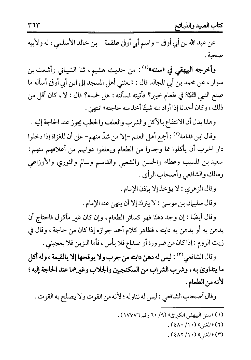 وقال ابن قدامة (¬2): أجمع أهل العلم -إلا من شذّ منهم- على أن للغزاة إذا دخلوا دار الحرب أن يأكلوا مما وجدوا من الطعام ويعلفوا دوابهم من أعلافهم منهم: سعيد بن المسيب وعطاء والحسن والشعبي والقاسم وسالم والثوري والأوزاعي ومالك والشافعي وأصحاب الرأي.