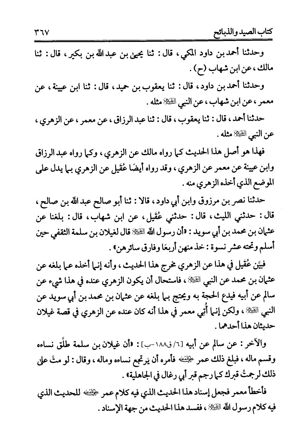 حدثنا نصر بن مرزوق وابن أبي داود، قالا: ثنا أبو صالح عبد الله بن صالح، قال: حدثني الليث، قال: حدثني عُقَيل، عن ابن شهاب، قال: بلغنا عن عثمان بن محمد بن أبي سويد: "أن رسول الله -عليه السلام- قال لغيلان بن سلمة الثقفي حين أسلم وتحته عشر نسوة: خد منهن أربعًا وفارق سائرهن".