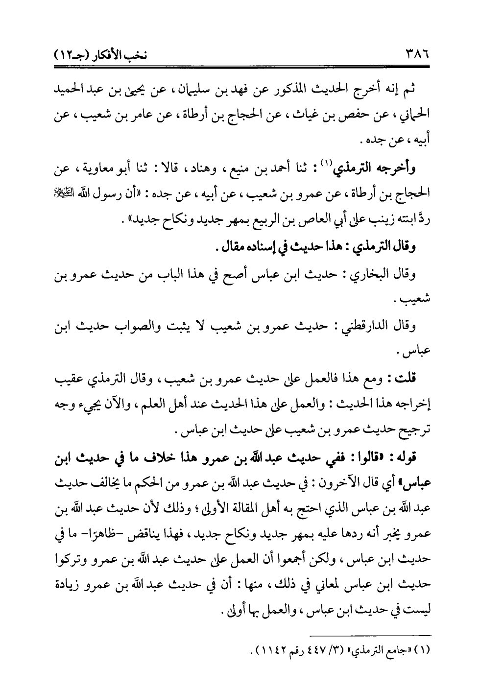 قلت: ومع هذا فالعمل على حديث عمرو بن شعيب، وقال الترمذي عقيب إخراجه هذا الحديث: والعمل على هذا الحديث عند أهل العلم، والآن يجيء وجه ترجيح حديث عمرو بن شعيب على حديث ابن عباس.