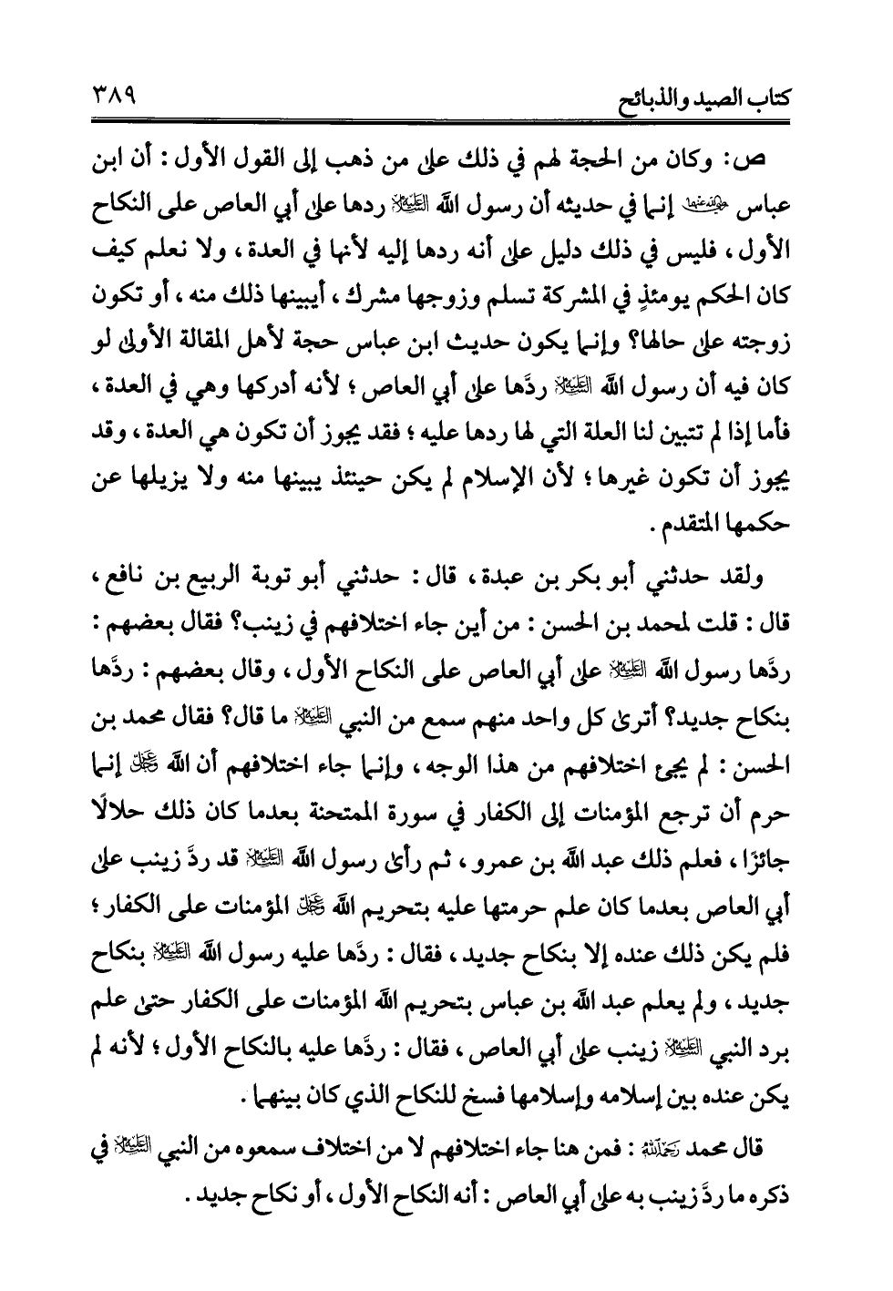 قال محمد -رحمه الله-: فمن هنا جاء اختلافهم لا من اختلاف سمعوه من النبي -عليه السلام- في ذكره ما ردَّ زينب به على أبي العاص: أنه النكاح الأول، أو نكاح جديد.