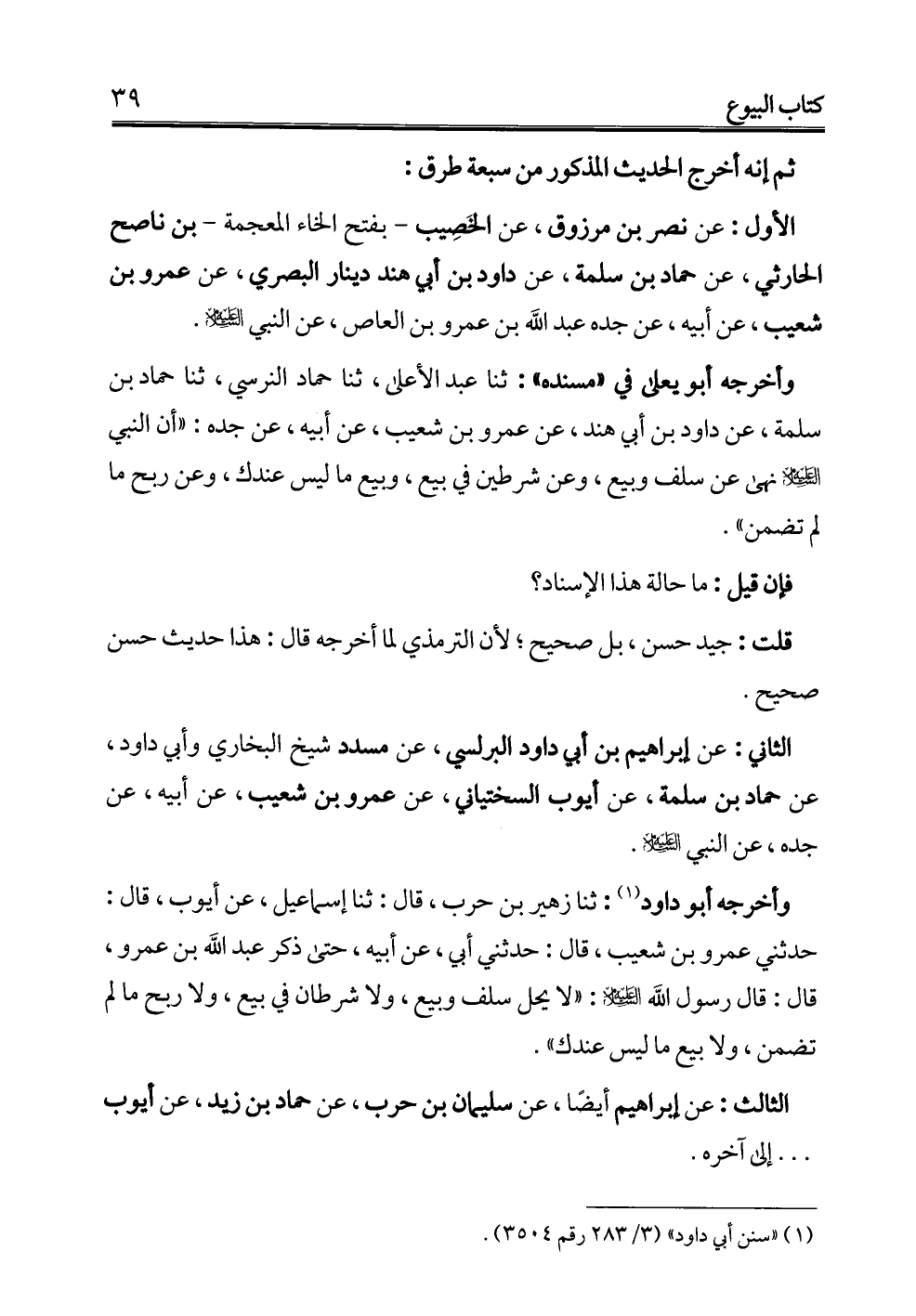 وأخرجه أبو داود (¬1): ثنا زهير بن حرب، قال: ثنا إسماعيل، عن أيوب، قال: حدثني عمرو بن شعيب، قال: حدثني أبي، عن أبيه، حتى ذكر عبد الله بن عمرو، قال: قال رسول الله -عليه السلام-: "لا يحل سلف وبيع، ولا شرطان في بيع، ولا ربح ما لم تضمن، ولا بيع ما ليس عندك".