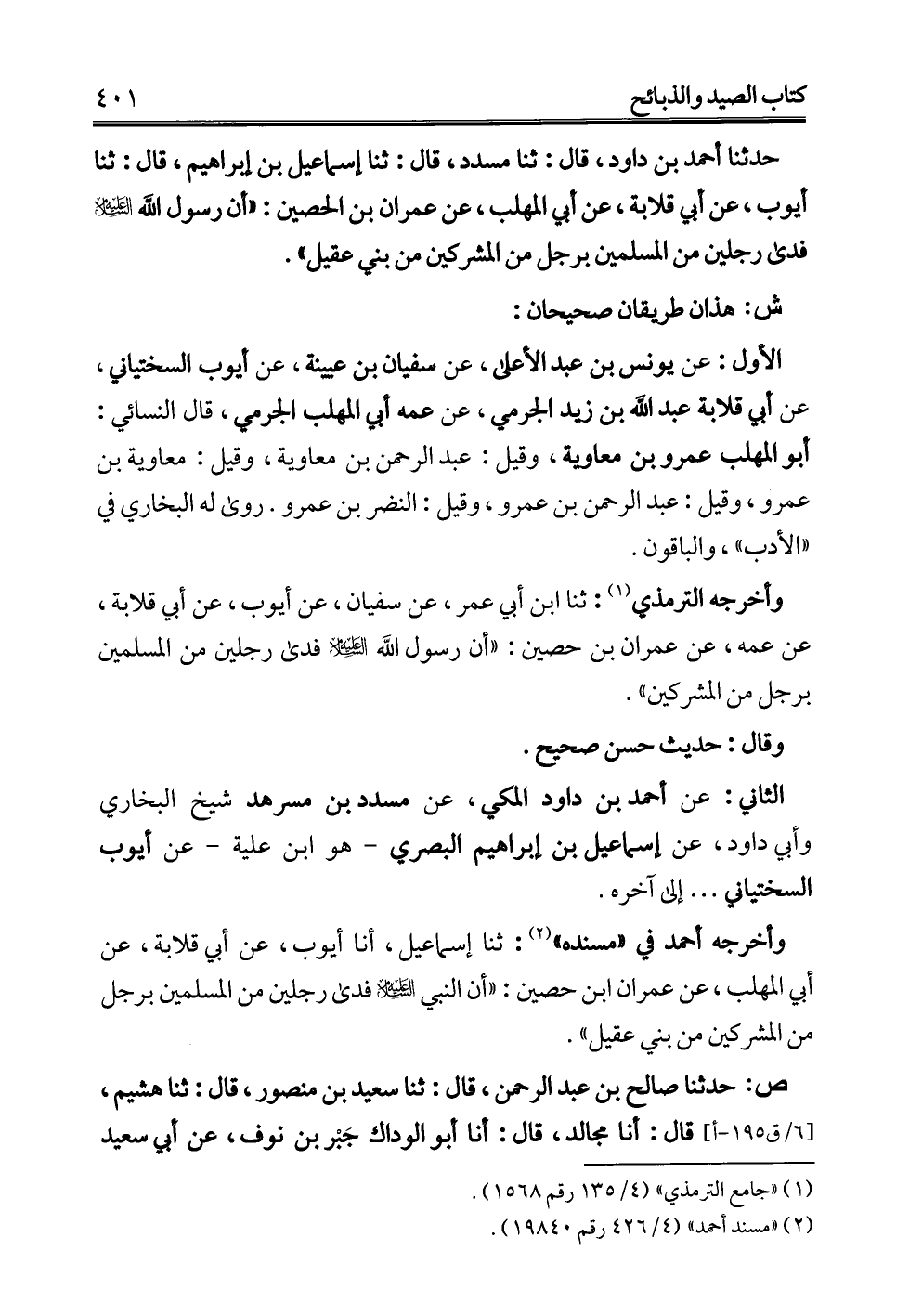 حدثنا أحمد بن داود، قال: ثنا مسدد، قال: ثنا إسماعيل بن إبراهيم، قال: ثنا أيوب، عن أبي قلابة، عن أبي المهلب، عن عمران بن الحصين: "أن رسول الله -عليه السلام- فدى رجلين من المسلمين برجل من المشركين من بني عقيل".