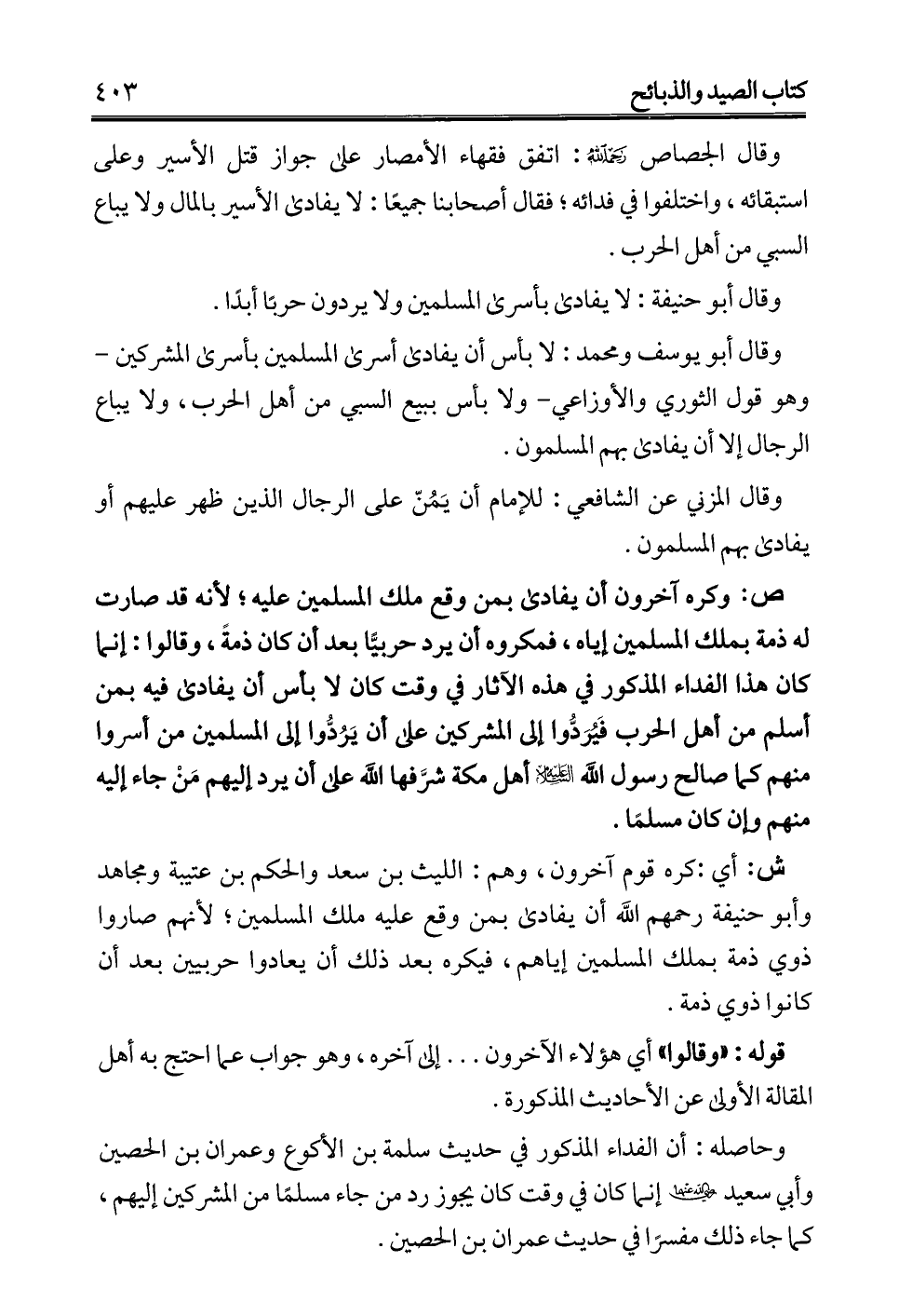 ش: أي: كره قوم آخرون، وهم: الليث بن سعد والحكم بن عتيبة ومجاهد وأبو حنيفة -رحمهم الله- أن يفادى بمن وقع عليه ملك المسلمين؛ لأنهم صاروا ذوي ذمة بملك المسلمين إياهم، فيكره بعد ذلك أن يعادوا حربيين بعد أن كانوا ذوي ذمة.