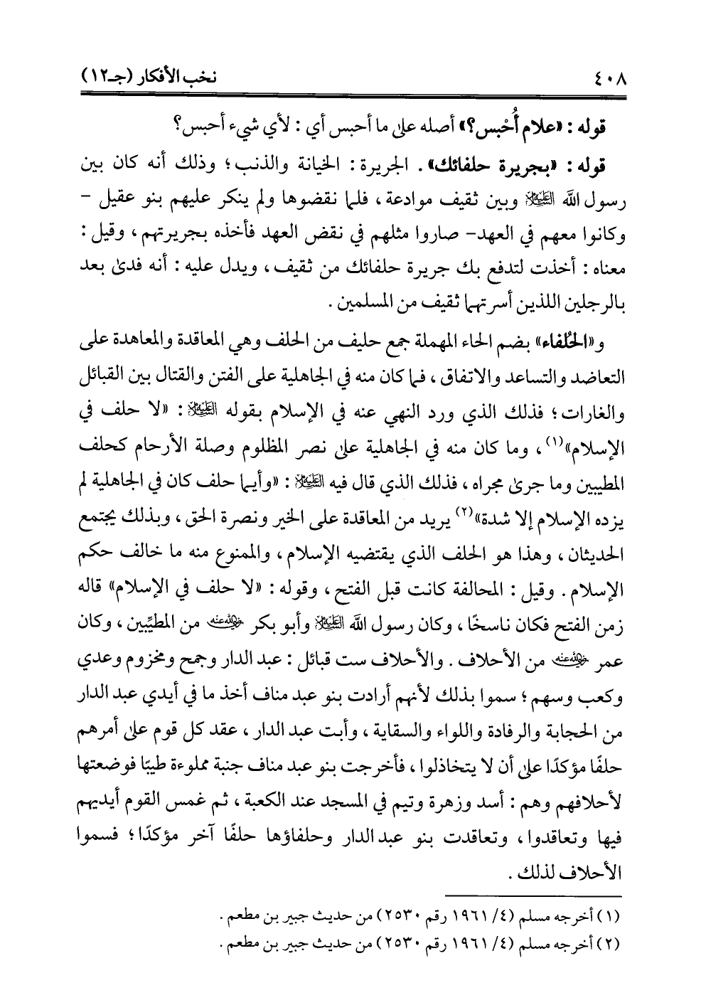 و"الحُلفاء" بضم الحاء المهملة جمع حليف من الحلف وهي المعاقدة والمعاهدة على التعاضد والتساعد والاتفاق، فما كان منه في الجاهلية على الفتن والقتال بين القبائل والغارات؛ فذلك الذي ورد النهي عنه في الإِسلام بقوله -عليه السلام-: "لا حلف في الإِسلام" (¬1)، وما كان منه في الجاهلية على نصر المظلوم وصلة الأرحام كحلف المطيبين وما جرى مجراه، فذلك الذي قال فيه -عليه السلام-: "وأيما حلف كان في الجاهلية لم يزده الإِسلام إلا شدة" (¬2) يريد من المعاقدة على الخير ونصرة الحق، وبذلك يجتمع الحديثان، وهذا هو الحلف الذي يقتضيه الإِسلام، والممنوع منه ما خالف حكم الإِسلام. وقيل: المحالفة كانت قبل الفتح، وقوله: "لا حلف في الإِسلام" قاله زمن الفتح فكان ناسخًا، وكان رسول الله -عليه السلام- وأبو بكر -رضي الله عنه- من المطيِّبين، وكان عمر -رضي الله عنه- من الأحلاف. والأحلاف ست قبائل: عبد الدار وجمح ومخزوم وعدي وكعب وسهم؛ سموا بذلك لأنهم أرادت بنو عبد مناف أخذ ما في أيدي عبد الدار من الحجابة والرفادة واللواء والسقاية، وأبت عبد الدار، عقد كل قوم على أمرهم حلفًا مؤكدًا على أن لا يتخاذلوا، فأخرجت بنو عبد مناف جنبة مملوءة طيبًا فوضعتها لأحلافهم وهم: أسد وزهرة وتيم في المسجد عند الكعبة، ثم غمس القوم أيديهم فيها وتعاقدوا، وتعاقدت بنو عبد الدار وحلفاؤها حلفًا آخر مؤكدًا؛ فسموا الأحلاف لذلك.