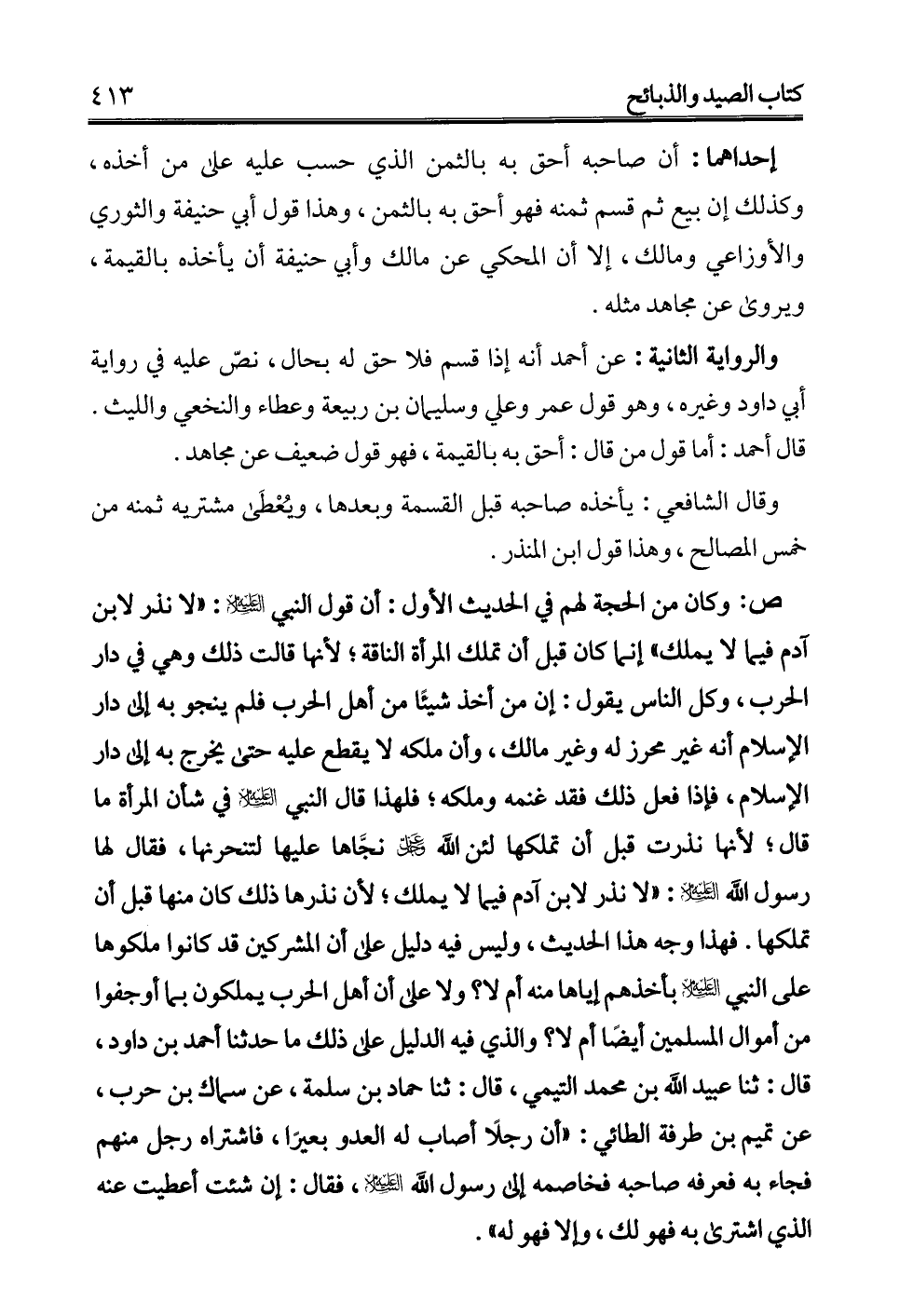 وقال الشافعي: يأخذه صاحبه قبل القسمة وبعدها، ويُعْطَى مشتريه ثمنه من خمس المصالح، وهذا قول ابن المنذر. ص: وكان من الحجة لهم في الحديث الأول: أن قول النبي -عليه السلام-: "لا نذر لابن آدم فيما لا يملك" إنما كان قبل أن تملك المرأة الناقة؛ لأنها قالت ذلك وهي في دار الحرب، وكل الناس يقول: إن من أخذ شيئًا من أهل الحرب فلم ينجو به إلى دار الإِسلام أنه غير محرز له وغير مالك، وأن ملكه لا يقطع عليه حتى يخرج به إلى دار الإِسلام، فإذا فعل ذلك فقد غنمه وملكه؛ فلهذا قال النبي -عليه السلام- في شأن المرأة ما قال؛ لأنها نذرت قبل أن تملكها لئن الله -عز وجل- نجَّاها عليها لتنحرنها، فقال لها رسول الله -عليه السلام-: "لا نذر لابن آدم فيما لا يملك؛ لأن نذرها ذلك كان منها قبل أن تملكها. فهذا وجه هذا الحديث، وليس فيه دليل على أن المشركين قد كانوا ملكوها على النبي -عليه السلام- بأخذهم إياها منه أم لا؟ ولا على أن أهل الحرب يملكون بما أوجفوا من أموال المسلمين أيضًا أم لا؟ والذي فيه الدليل على ذلك ما حدثنا أحمد بن داود، قال: ثنا عبيد الله بن محمد التيمي، قال: ثنا حماد بن سلمة، عن سماك بن حرب، عن تميم بن طرفة الطائي: "أن رجلاً أصاب له العدو بعيرًا، فاشتراه رجل منهم فجاء به فعرفه صاحبه فخاصمه إلى رسول الله -عليه السلام-، فقال: إن شئت أعطيت عنه الذي اشترى به فهو لك، وإلا فهو له".