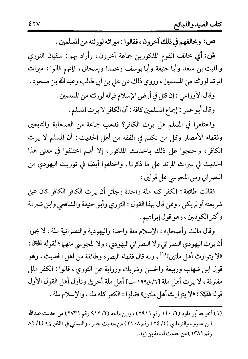 ش: أي خالف القوم المذكورين جماعة آخرون، وأراد بهم: سفيان الثوري والليث بن سعد وأبا حنيفة وأبا يوسف ومحمدًا وإسحاق، فإنهم قالوا: ميراث المرتد لورثته من المسلمين، وروي ذلك عن علي بن أبي طالب وعبد الله بن مسعود.