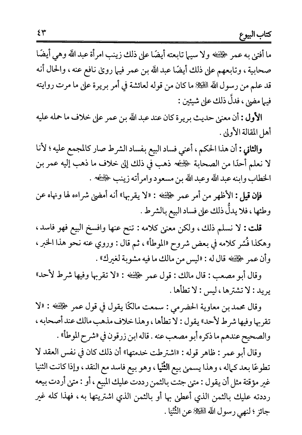ما أفتي به عمر -رضي الله عنه- ولا سيما تابعته أيضًا على ذلك زينب امرأة عبد الله وهي أيضًا صحابية، وتابعهم على ذلك أيضًا عبد الله بن عمر فيما روى نافع عنه، والحال أنه قد علم من رسول الله -عليه السلام- ما كان من قوله لعائشة في أمر بريرة على ما مرت روايته فيما مضى، فدلَّ ذلك على شيئين: