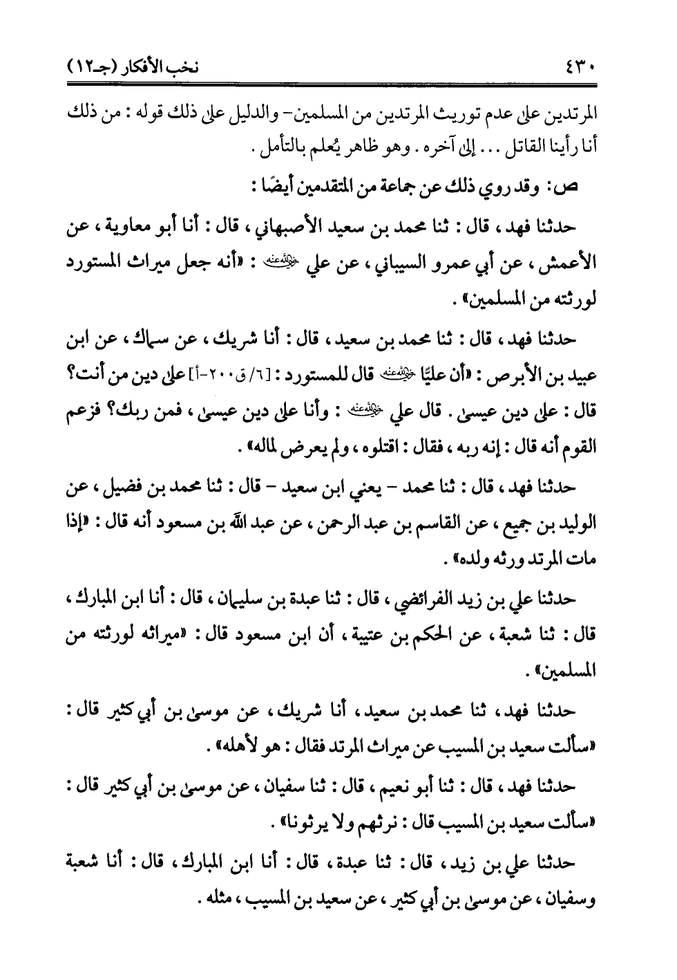 حدثنا علي بن زيد الفرائضي، قال: ثنا عبدة بن سليمان، قال: أنا ابن المبارك، قال: ثنا شعبة، عن الحكم بن عتيبة، أن ابن مسعود قال: "ميراثه لورثته من المسلمين".