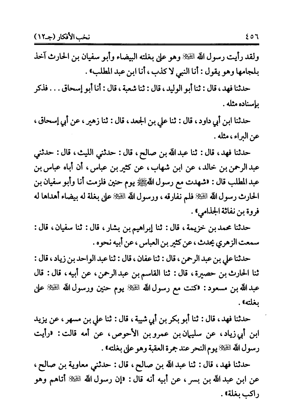 حدثنا فهد، قال: ثنا عبد الله بن صالح، قال: حدثني الليث، قال: حدثني عبد الرحمن بن خالد، عن ابن شهاب، عن كثير بن عباس، أن أباه عباس بن عبد المطلب قال: "شهدت مع رسول - صلى الله عليه وسلم - يوم حنين فلزمت أنا وأبو سفيان بن الحارث رسول الله -عليه السلام- فلم نفارقه، ورسول الله -عليه السلام- على بغلة له بيضاء أهداها له فروة بن نفاثة الجذامي".