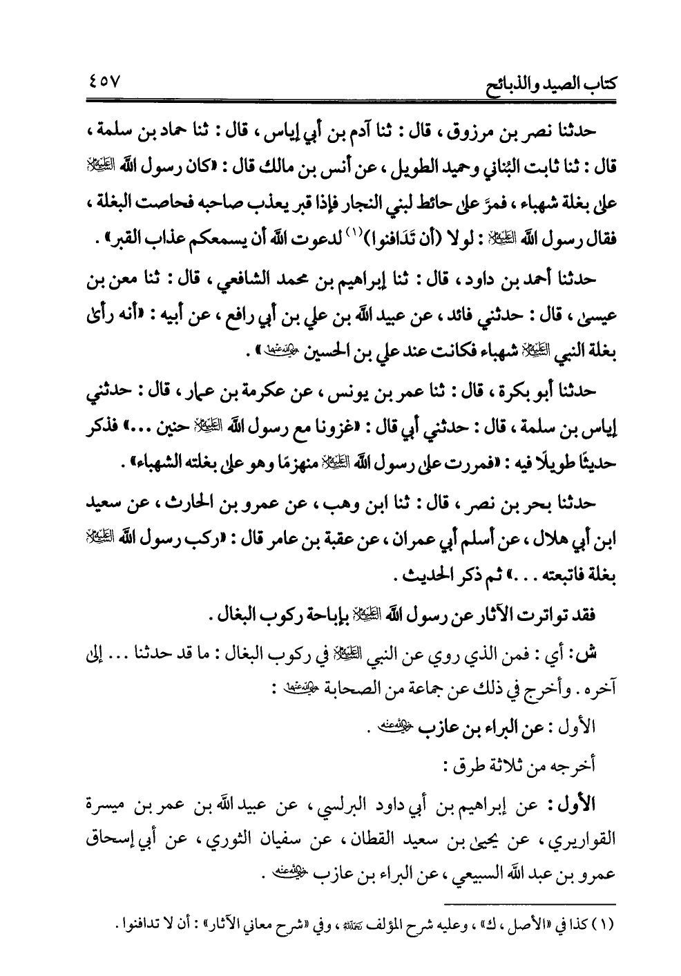 حدثنا أحمد بن داود، قال: ثنا إبراهيم بن محمد الشافعي، قال: ثنا معن بن عيسى، قال: حدثني فائد، عن عبيد الله بن علي بن أبي رافع، عن أبيه: "أنه رأى بغلة النبي -عليه السلام- شهباء فكانت عند علي بن الحسين -رضي الله عنهما-".