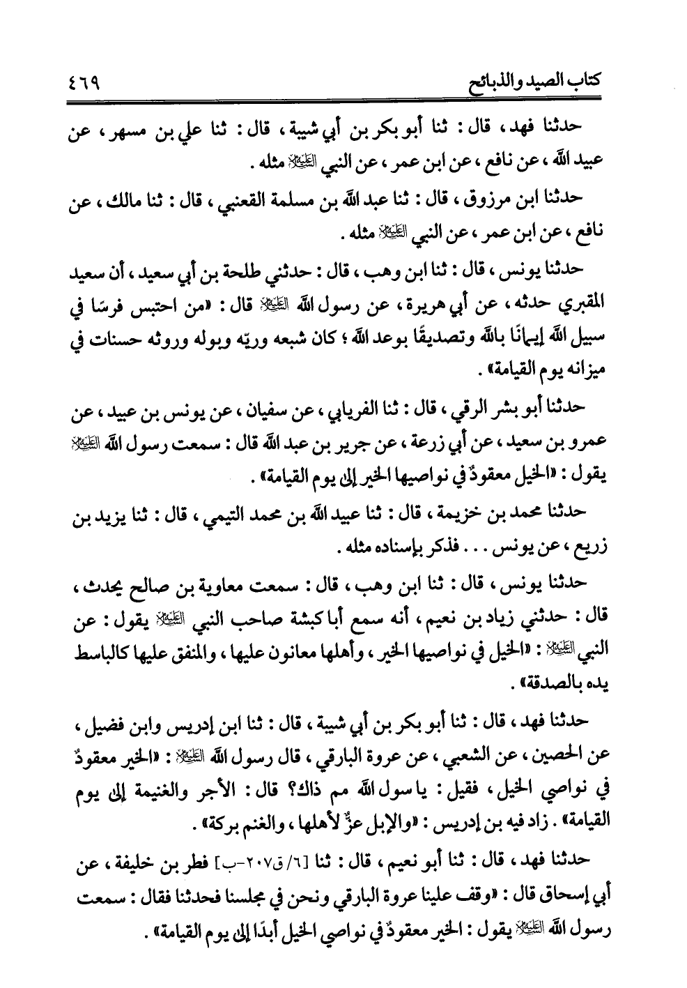 حدثنا فهد، قال: ثنا أبو بكر بن أبي شيبة، قال: ثنا ابن إدريس وابن فضيل، عن الحصين، عن الشعبي، عن عروة البارقي، قال رسول الله -عليه السلام-: "الخير معقودٌ في نواصي الخيل، فقيل: يا رسول الله مم ذاك؟ قال: الأجر والغنيمة إلى يوم القيامة". زاد فيه بن إدريس: "والإبل عزٌّ لأهلها، والغنم بركة".