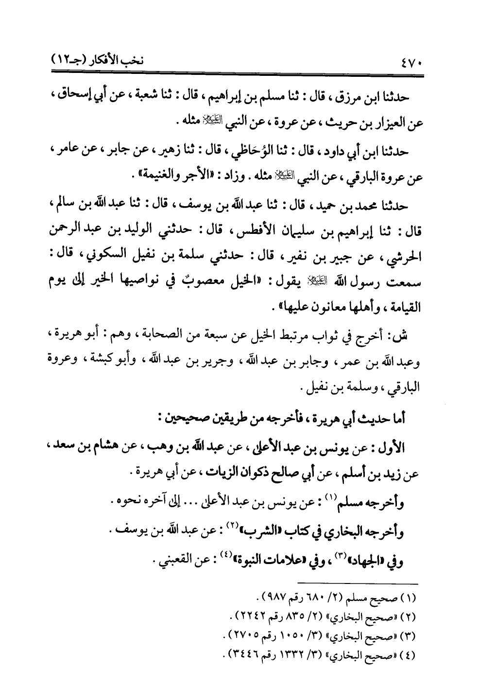ش: أخرج في ثواب مرتبط الخيل عن سبعة من الصحابة، وهم: أبو هريرة، وعبد الله بن عمر، وجابر بن عبد الله، وجرير بن عبد الله، وأبو كبشة، وعروة البارقي، وسلمة بن نفيل.