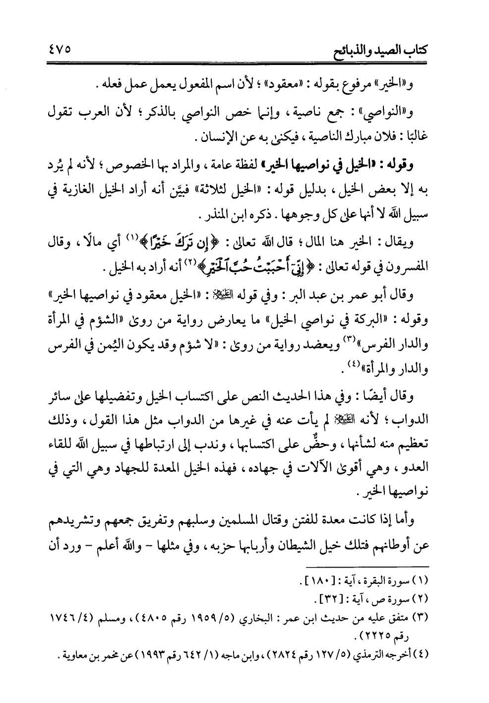 وقال أيضًا: وفي هذا الحديث النص على اكتساب الخيل وتفضيلها على سائر الدواب؛ لأنه -عليه السلام- لم يأت عنه في غيرها من الدواب مثل هذا القول، وذلك تعظيم منه لشأنها، وحضٌّ على اكتسابها، وندب إلى ارتباطها في سبيل الله للقاء العدو، وهي أقوى الآلات في جهاده، فهذه الخيل المعدة للجهاد وهي التي في نواصيها الخير.